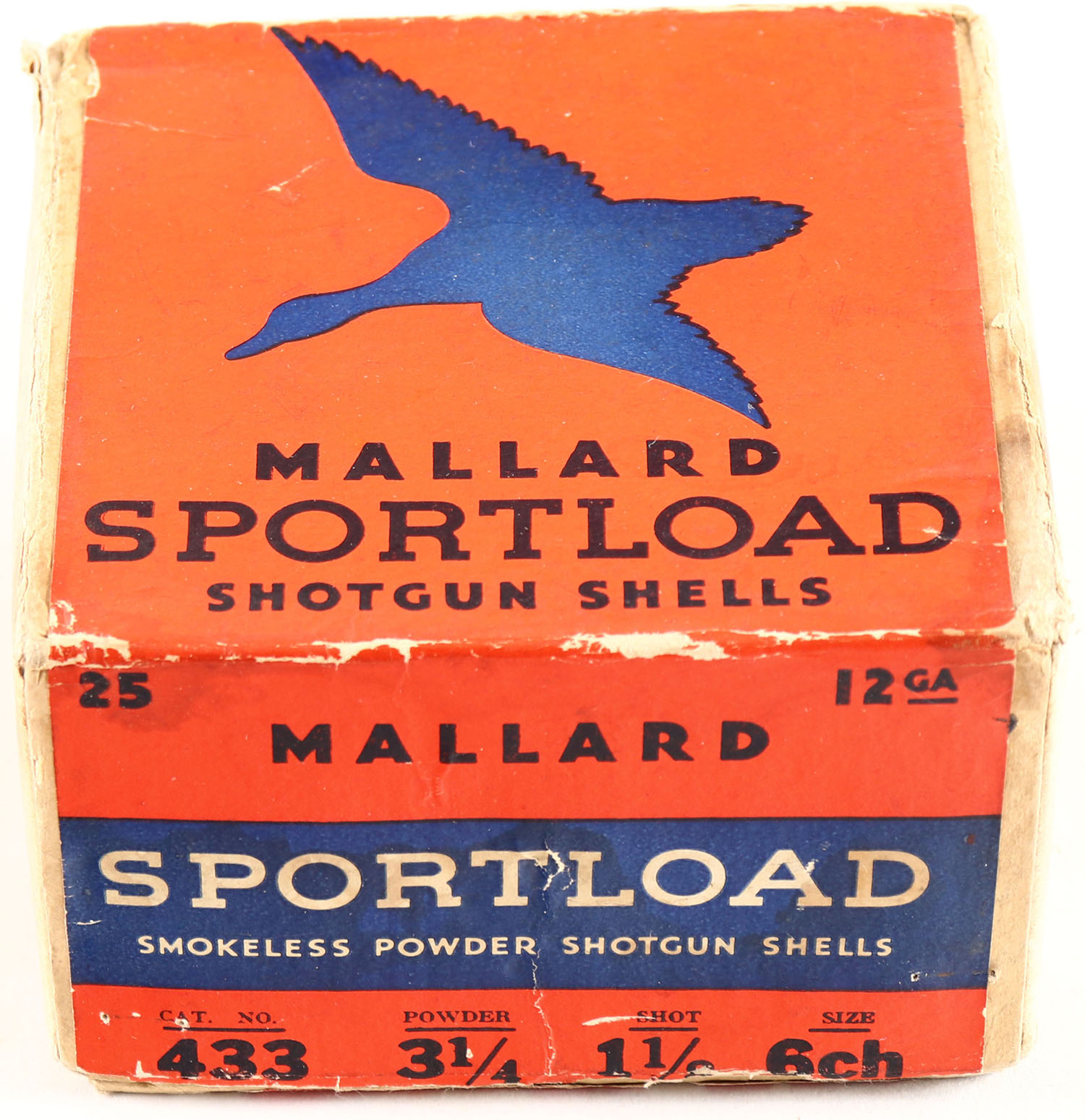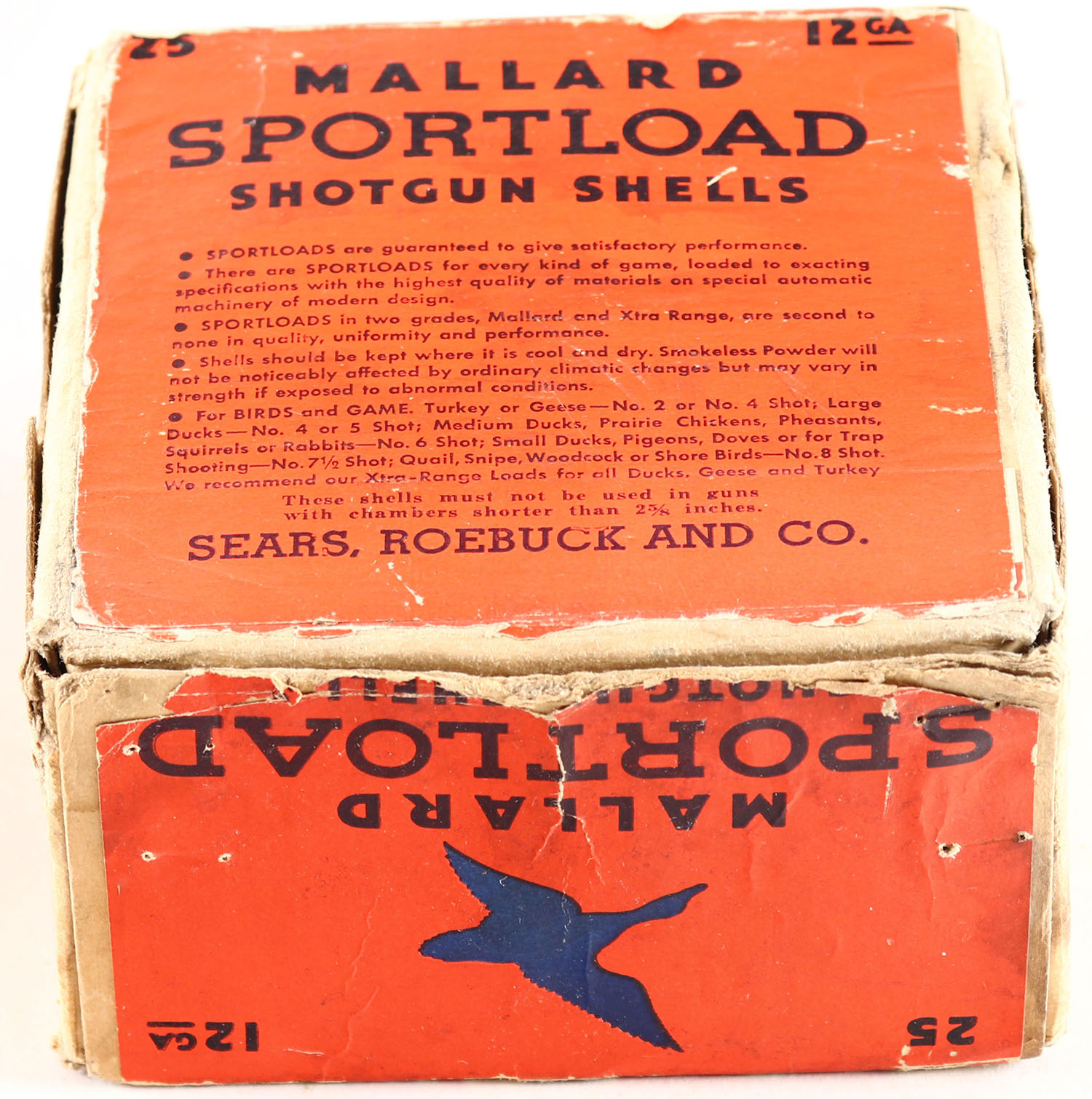 Sears, Sportload MALLARD, 12ga., 2pc., Full, shot size 6CH., red & blue box that pictures a Mallard in flight, box is solid with great colors with scuffing, shells are very good. Grade: Excellent - Value: 40 to 200