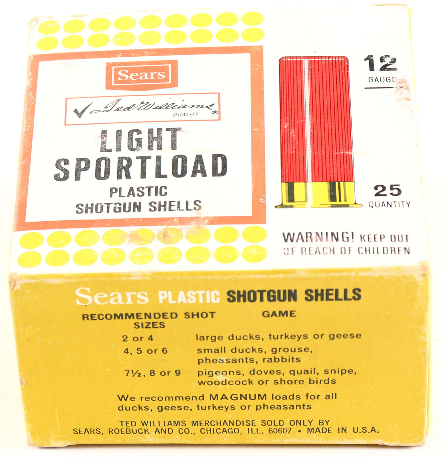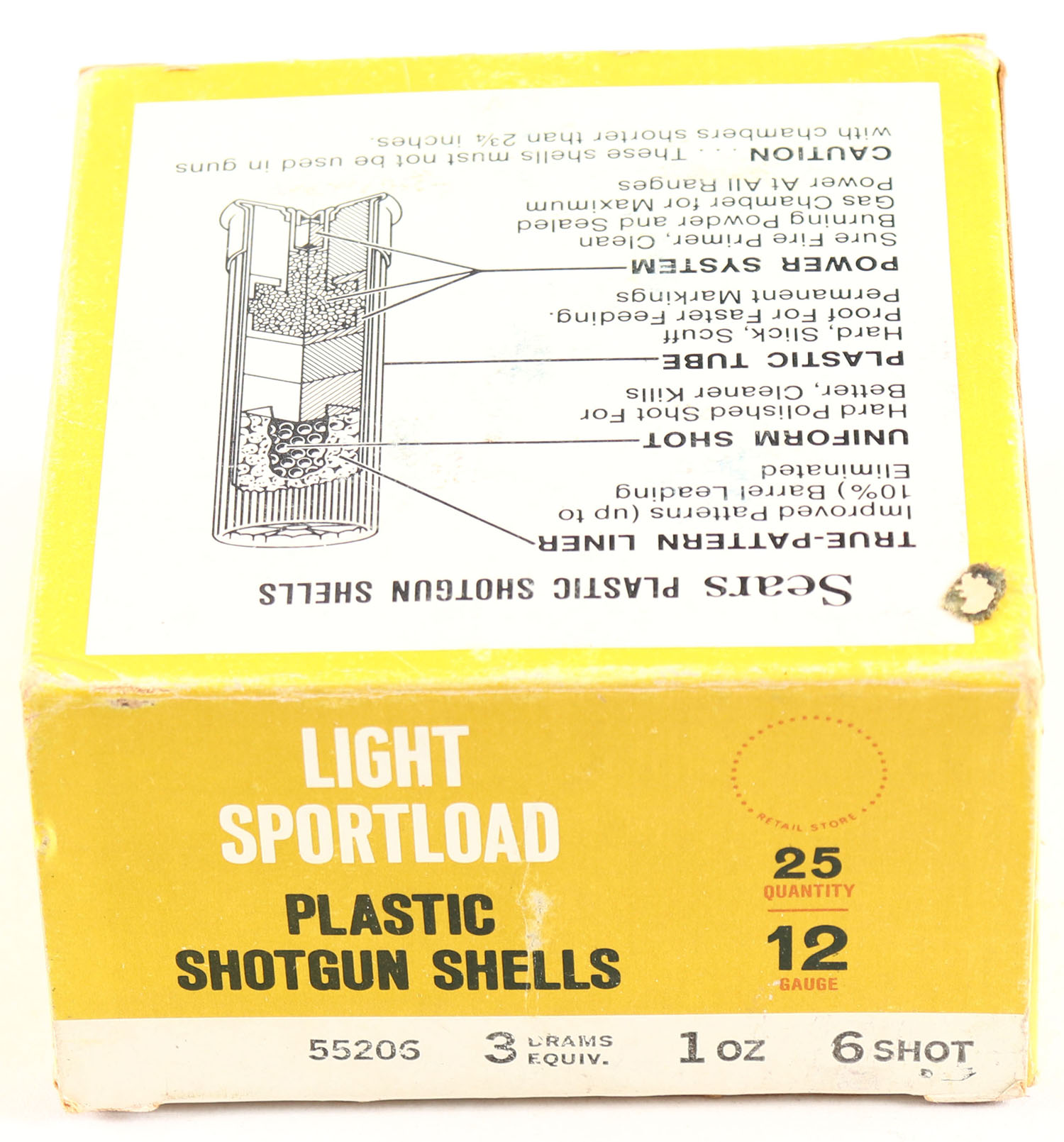 Sears, Light Sportload, 12ga., 1pc., Full, Shot Size 6, Multi-colored box is solid with very nice colors, shells are excellent. Grade: Excellent ++ - Value: 8 to 20