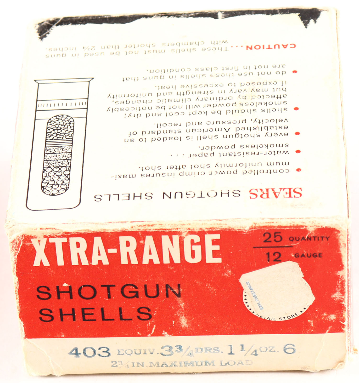 Sears, Xtra-Range, 12ga., 1pc., Full, Shot Size 6, box is solid with scuffing & very nice colors, shells are excellent. Grade: Excellent - Value: 8 to 20