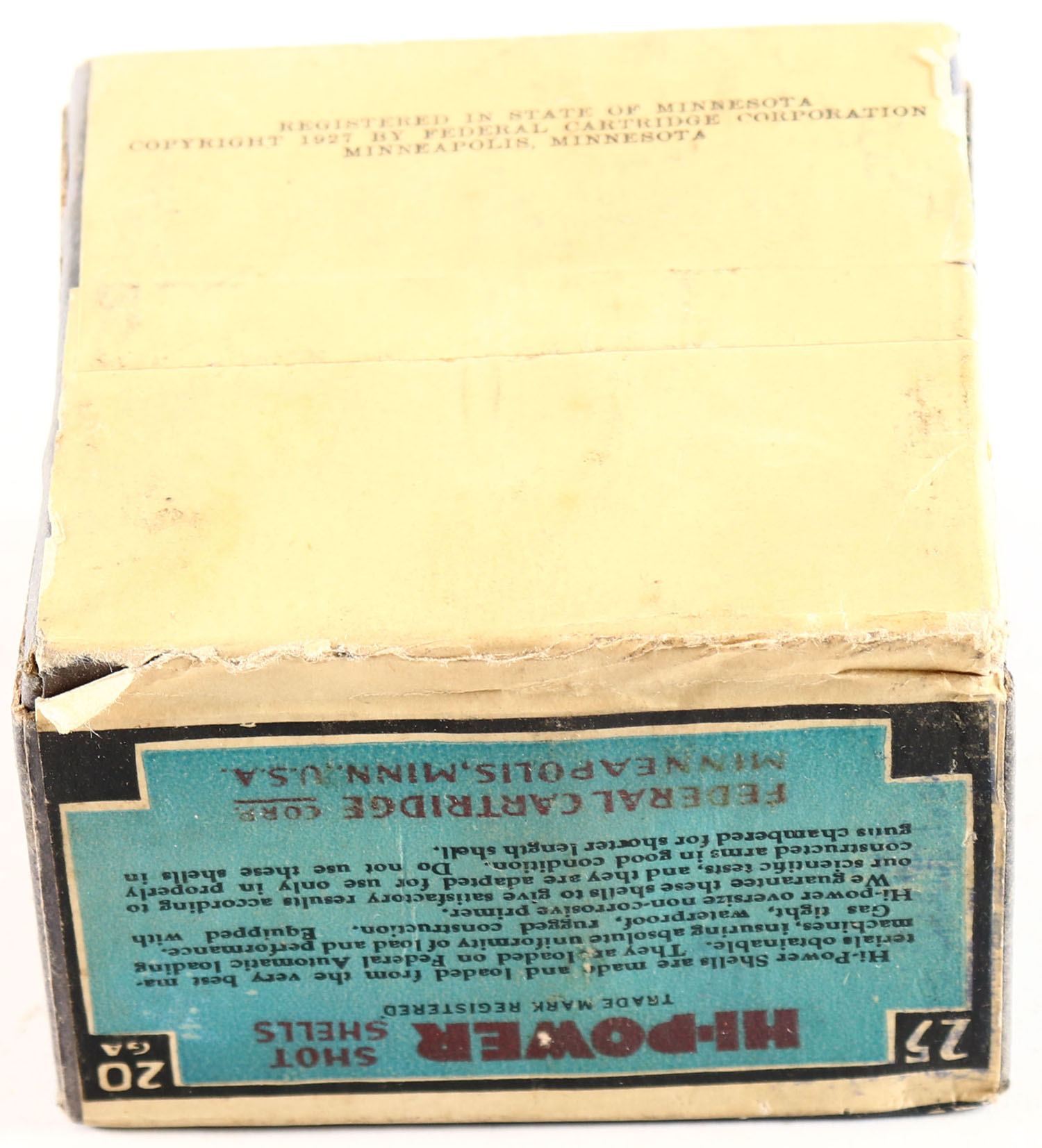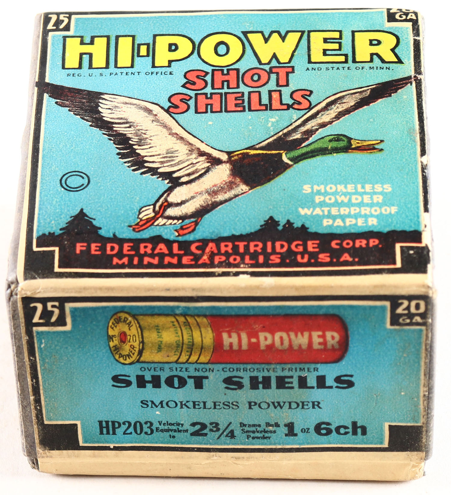 Federal Cart. Co., HI-POWER, 20ga., 2 PIECE!, FULL & SEALED, shot size 6ch, buff box with multi colored label that pictures Mallard in flight, box is very solid with very nice label. Grade: Excellent ++ - Value: 70 to 200