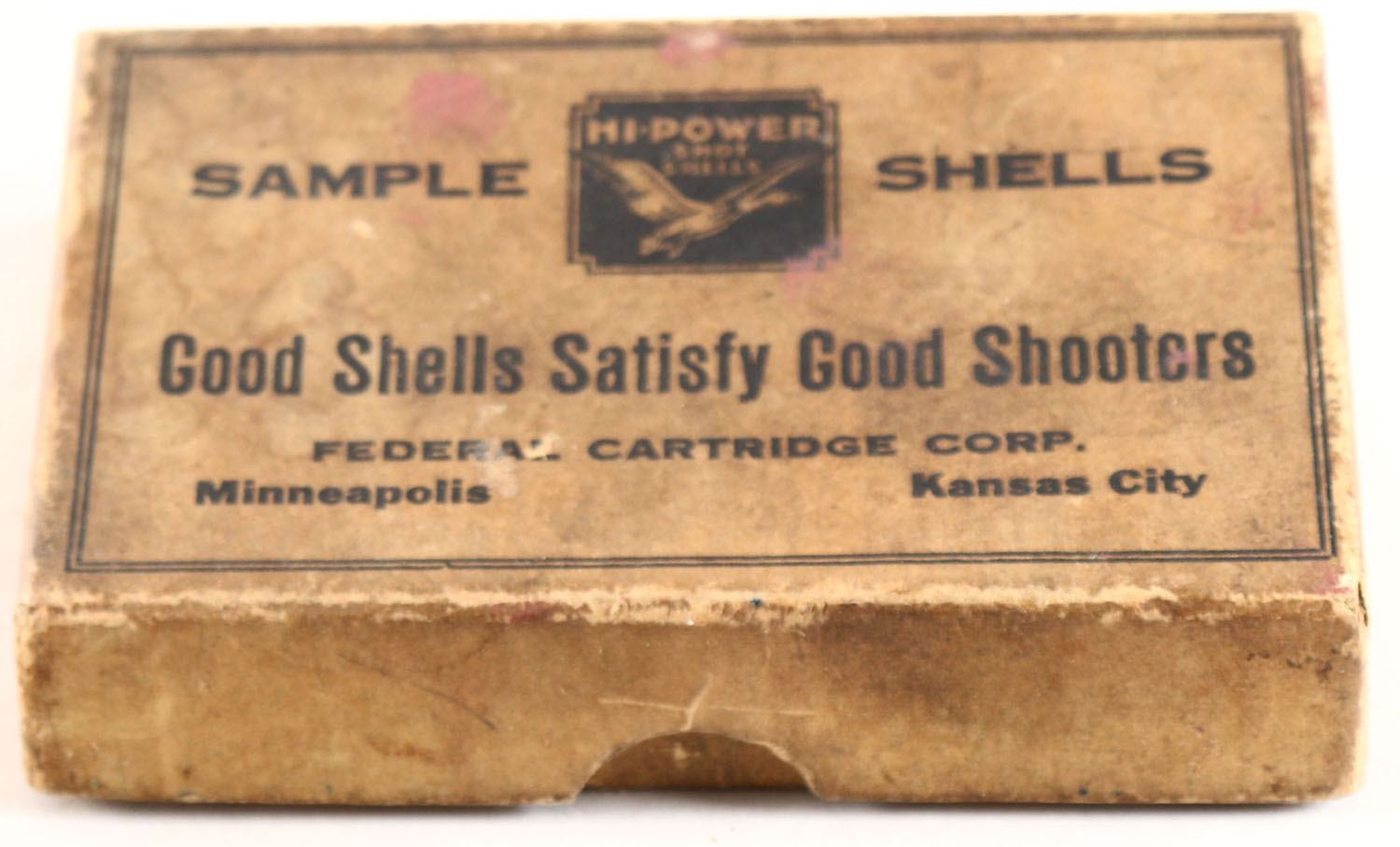 Federal, Hi-Power 5 pc salesman sample set in green box, ''SAMPLE SHELLS'' on front with flying mallard logo, shows 5 steps of shotshell loading, box is very solid and good, the five shells are very good. Grade: Very Good + - Value: 50 to 200