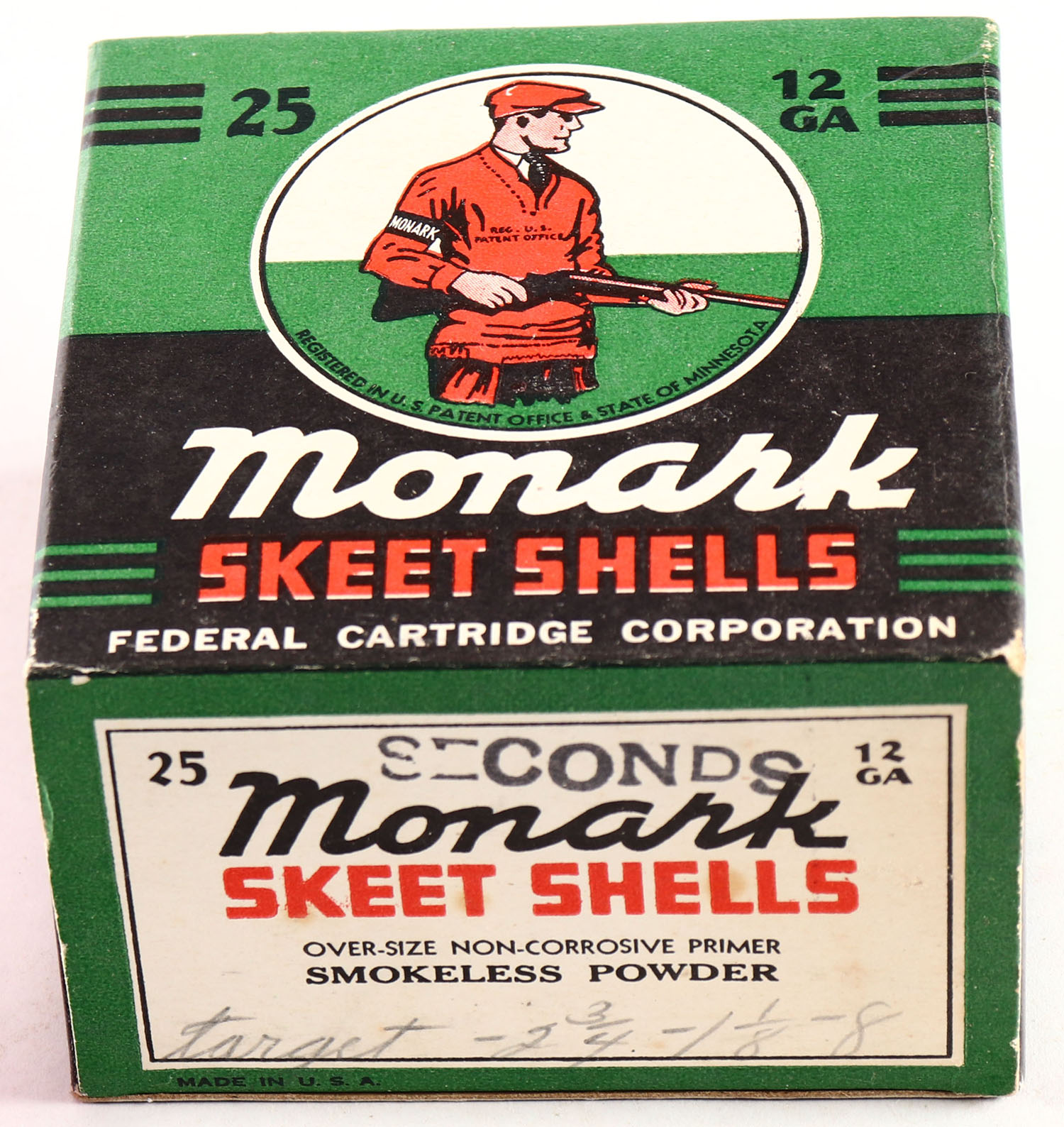 Federal Monark, Skeet Shells, 12ga., 1pc., Empty, shot size 8 Seconds, green, red & black box that pictures trap shooter with red sweater & cap, box is very solid with great color. Grade: Excellent ++ - Value: 20 to 40