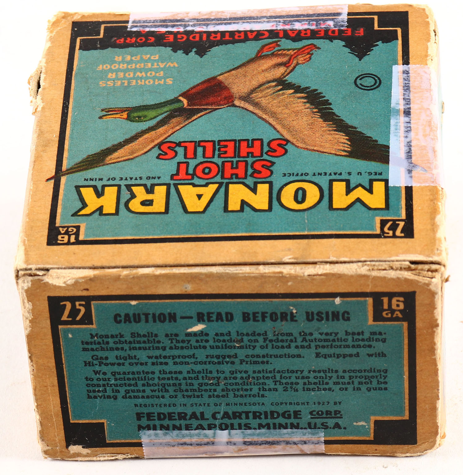 Federal Cart. Co., MONARK, 16ga., 1pc., Full, shot size 4ch, Black border, blue, yellow and red box with flying mallard, box has torn flap, box has edge wear with very nice color, Shells are good. Grade: Very Good ++ - Value: 20 to 40