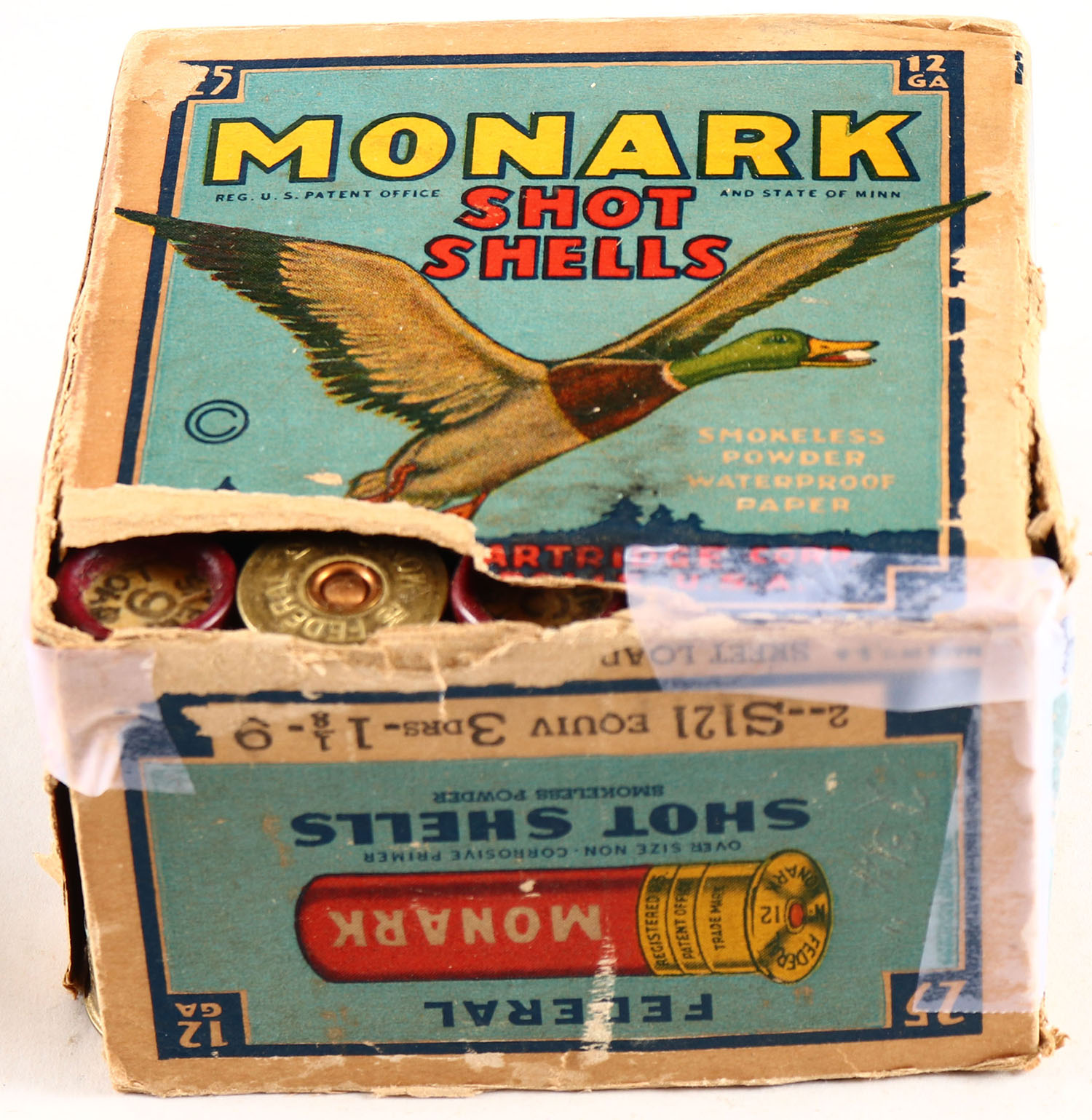Federal Cart. Co., MONARK, 12ga., 1pc., Full, shot size 9, Black border, blue, yellow and red box with flying mallard, box has soiling, bottom flap is torn, Shells are very good. Grade: Very Good ++ - Value: 20 to 40