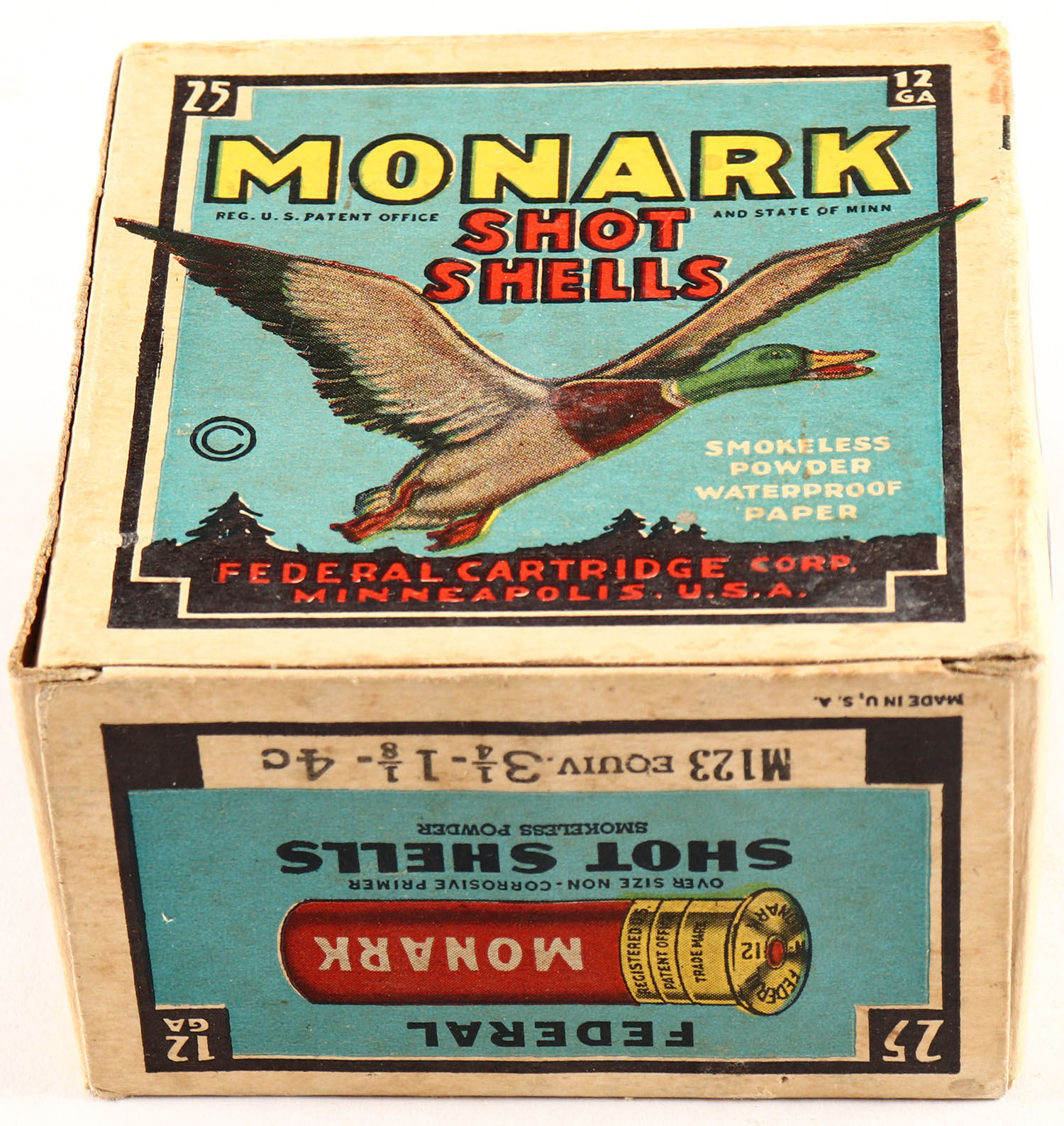 Federal Cart. Co., MONARK, 12ga., 1pc., Full, shot size 4c, Black border, blue, yellow and red box with flying mallard, box has light soiling with nice color, Shells are very good. Grade: Excellent - Value: 20 to 40