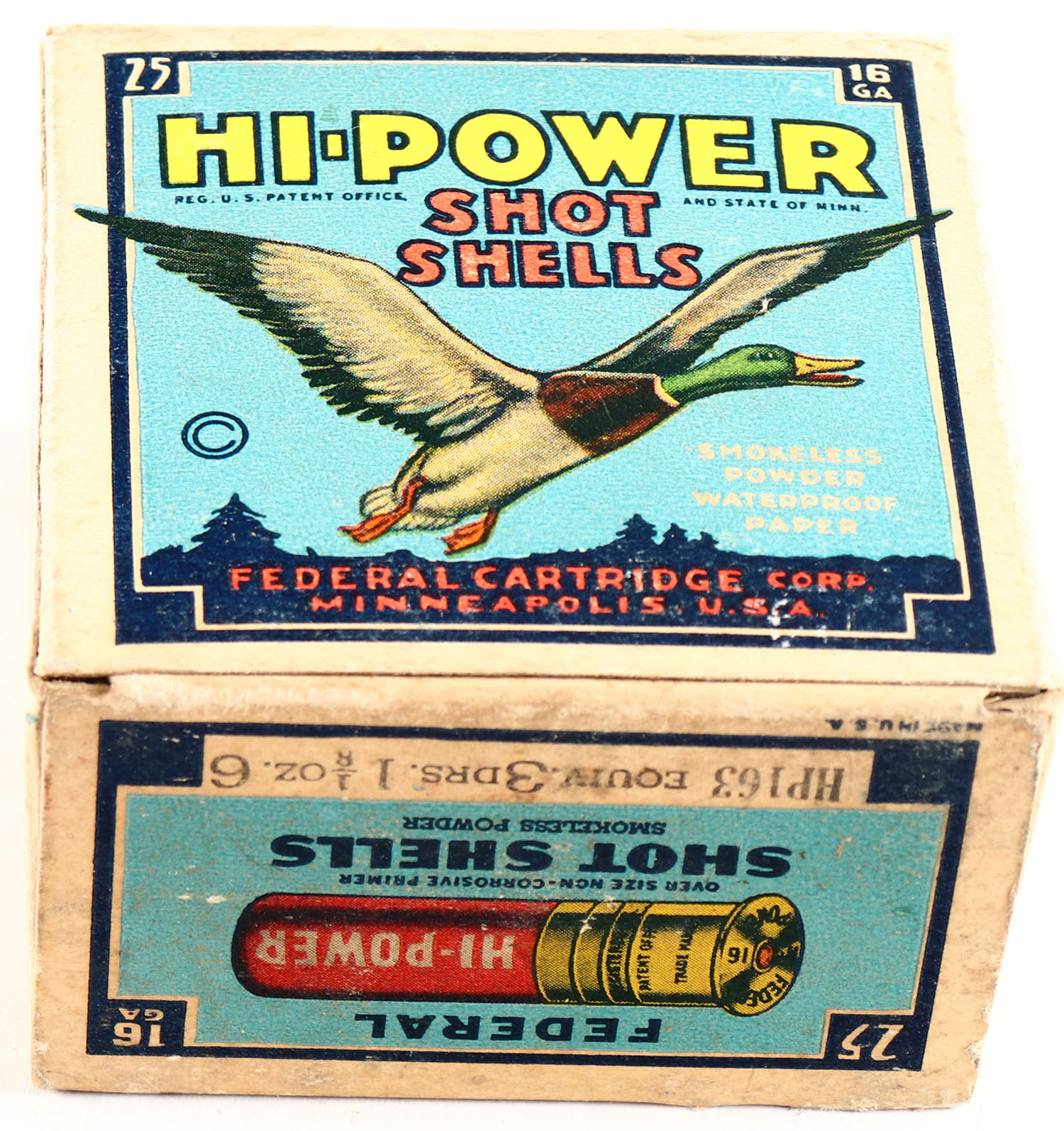 Federal Cart. Co., HI-POWER, 16ga., 1pc., Full, shot size 6, Blue border, blue, yellow and red box with flying mallard, box is very solid with some scuffing, Shells are excellent. Grade: Excellent + - Value: 20 to 40