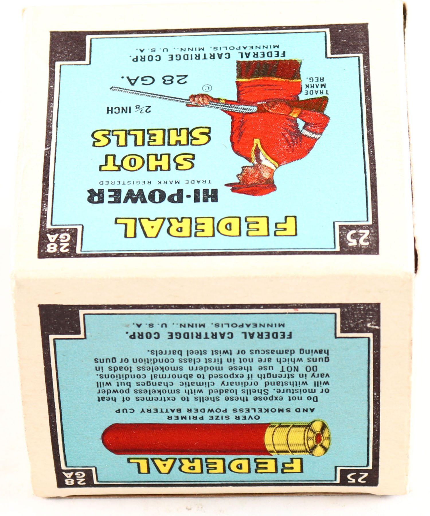 Federal Cart. Co., HI-POWER, 28ga., 1pc., Full, shot size ?, Blue border, blue, yellow and red box with Trap Shooter, box is very solid with great color. Grade: MINT - Value: 20 to 40