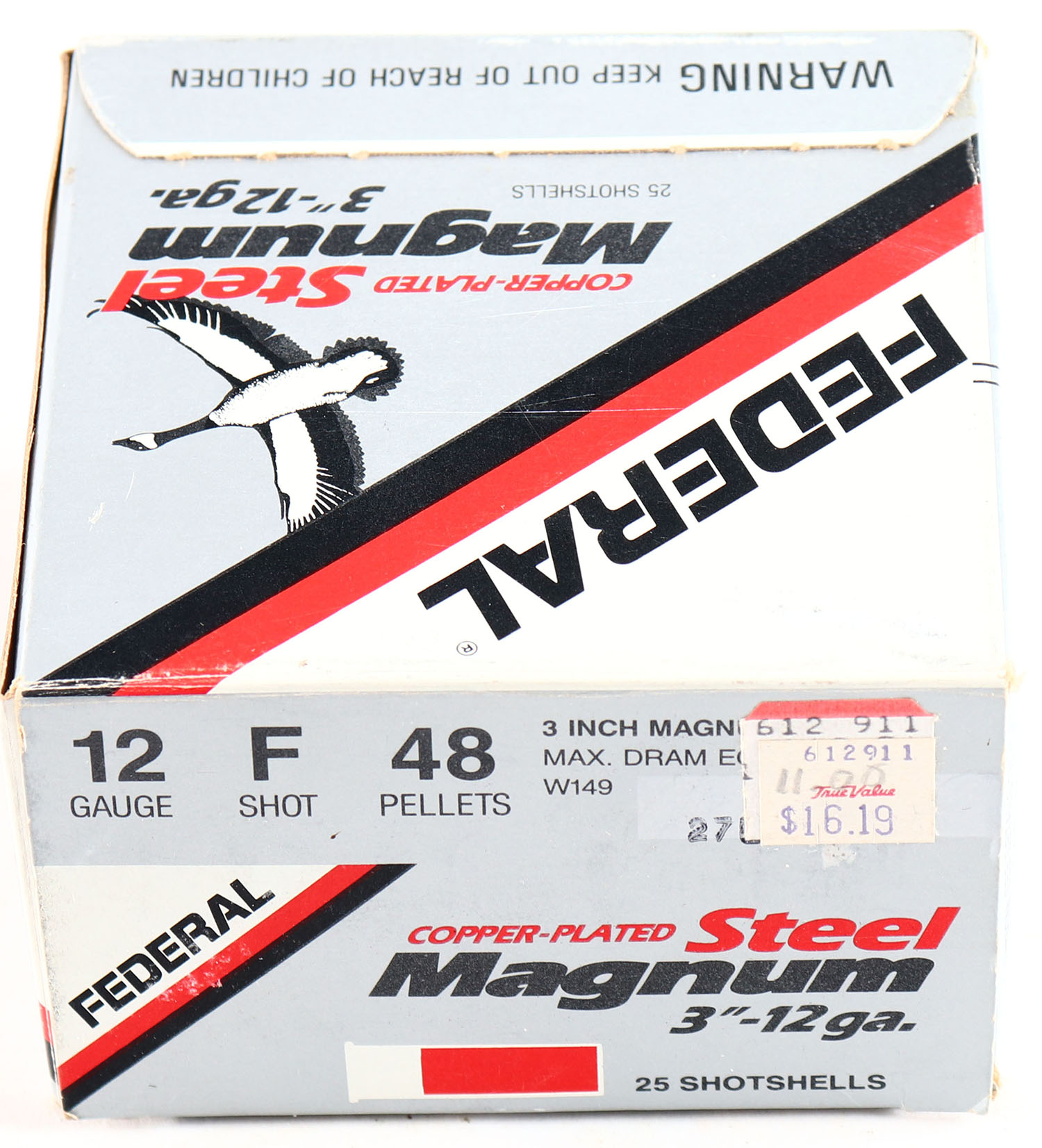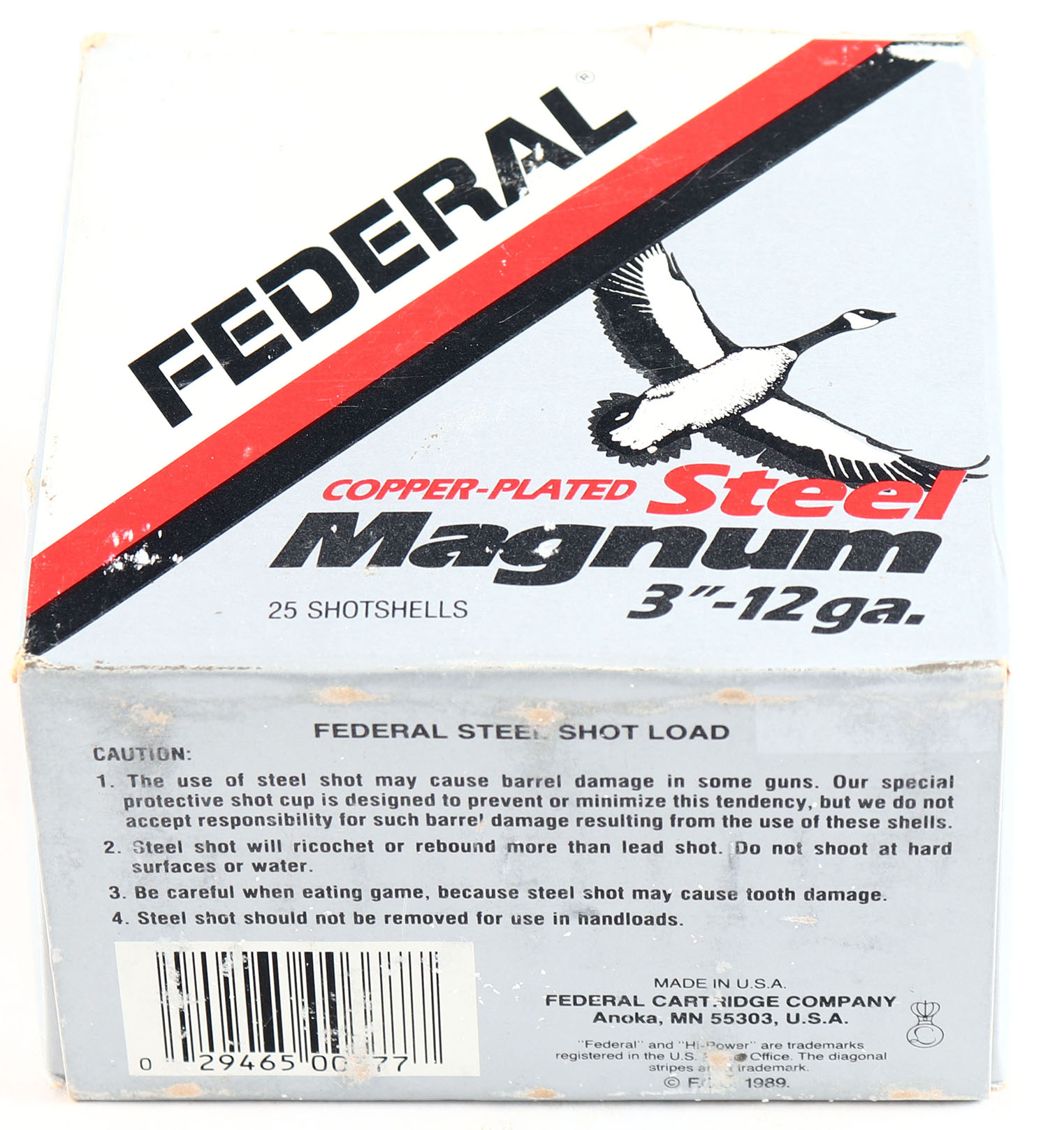 Federal, Copper-Plated Steel Magnum 12ga., 3'', 1pc., Full, shot size F, multi-colored box, box is solid, shells are excellent. Grade: Very Good ++ - Value: 10 to 30