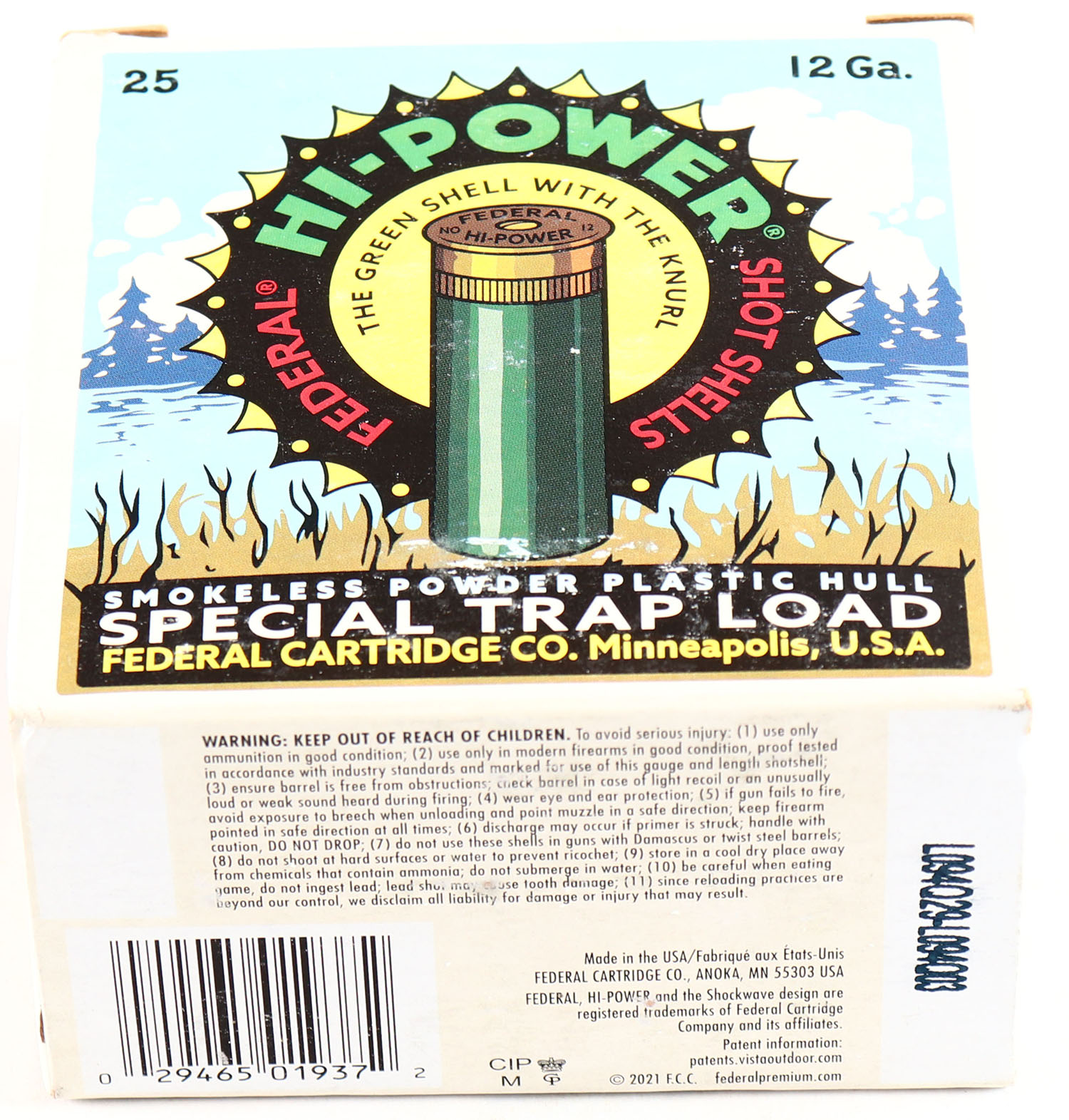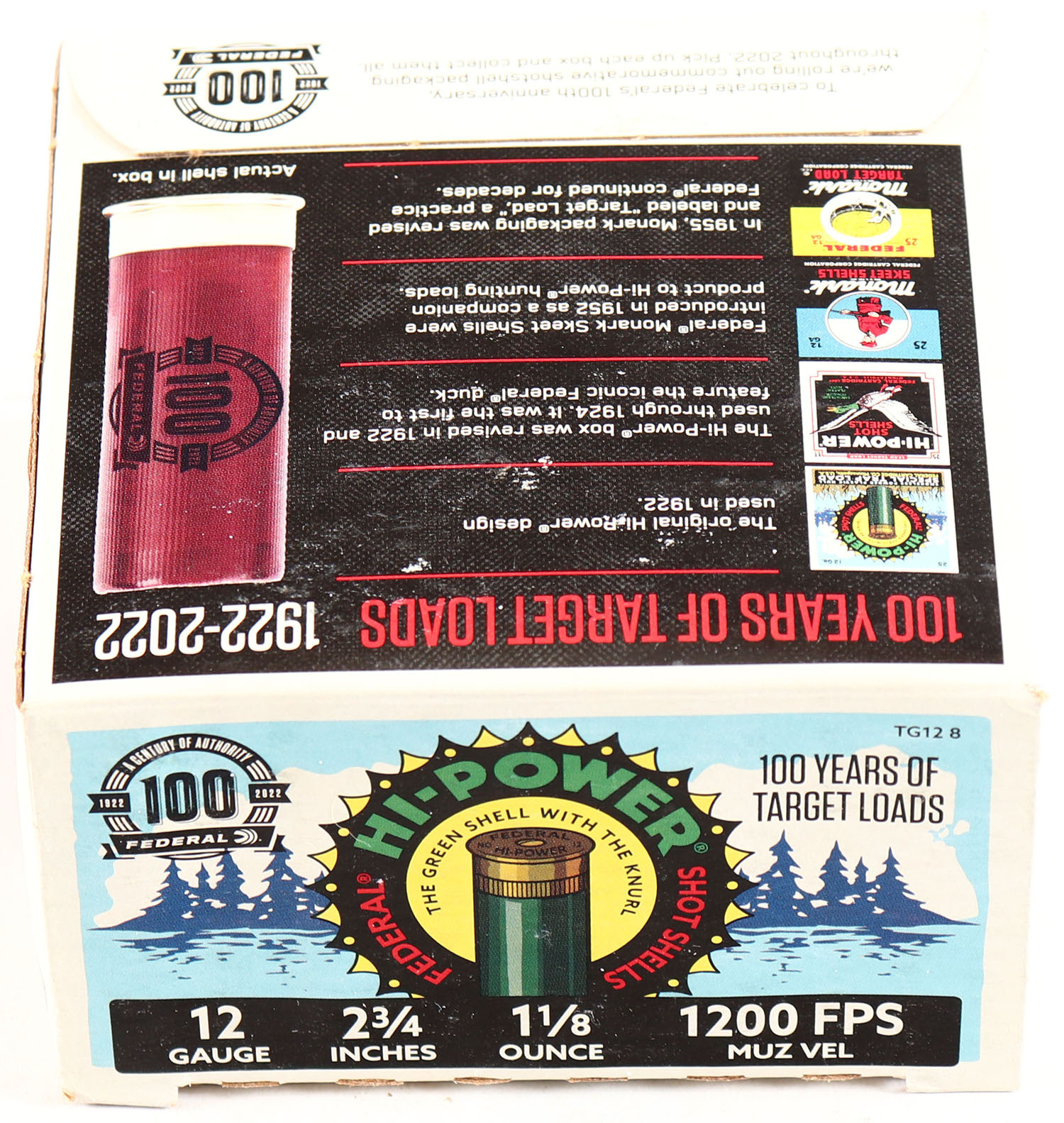 Federal Cart. Co., HI-POWER 100 Year Anniversary, 12ga., 1pc., Full, shot size 8 Special Trap Load, multi-colored box with Original Hi-Power Design, box is very solid with Minty color box shows earlier boxes & when they were introduced also tells little story about Federal, shells are Minty. Grade: Excellent ++ - Value: 20 to 60