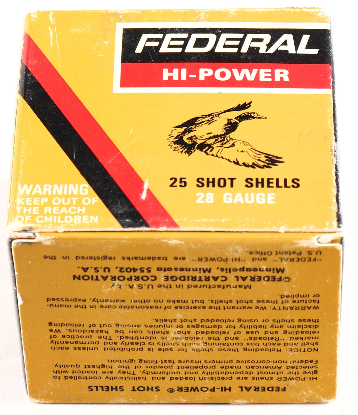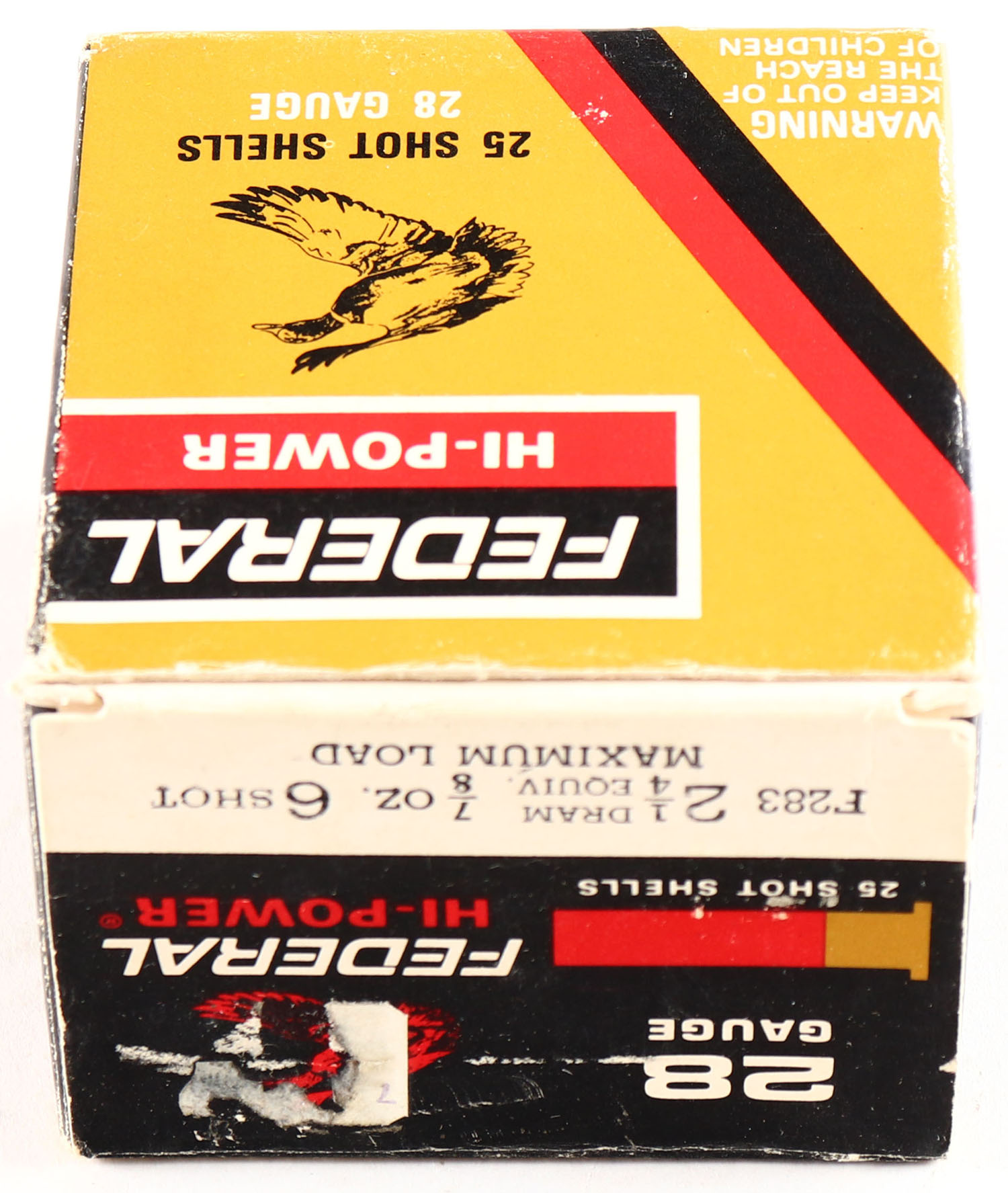 Federal, Hi-Power, 28ga., 1pc., Full, shot size 6, Maximum Load, box is solid with very nice colors, shells are very good. Grade: Excellent - Value: 10 to 30