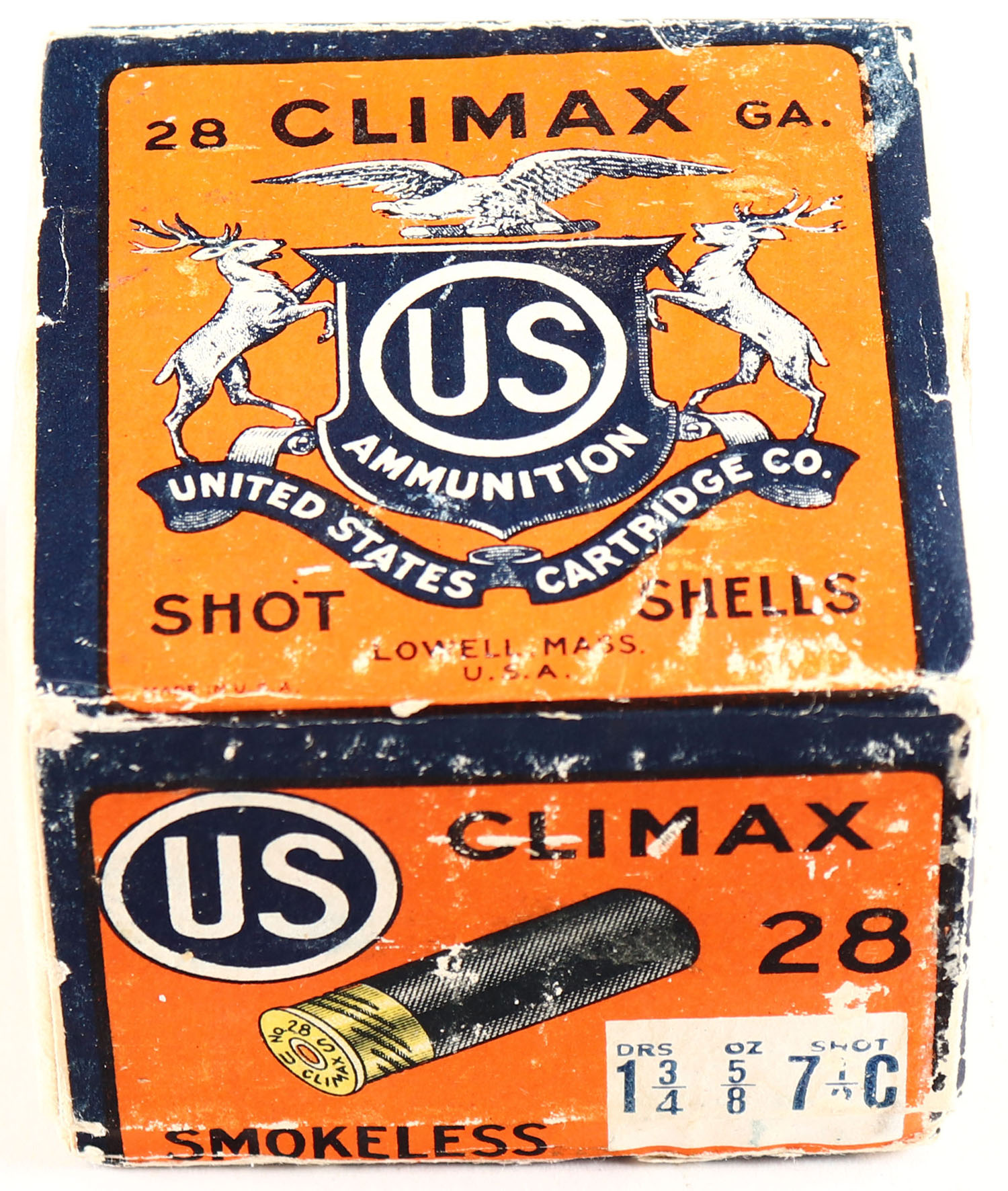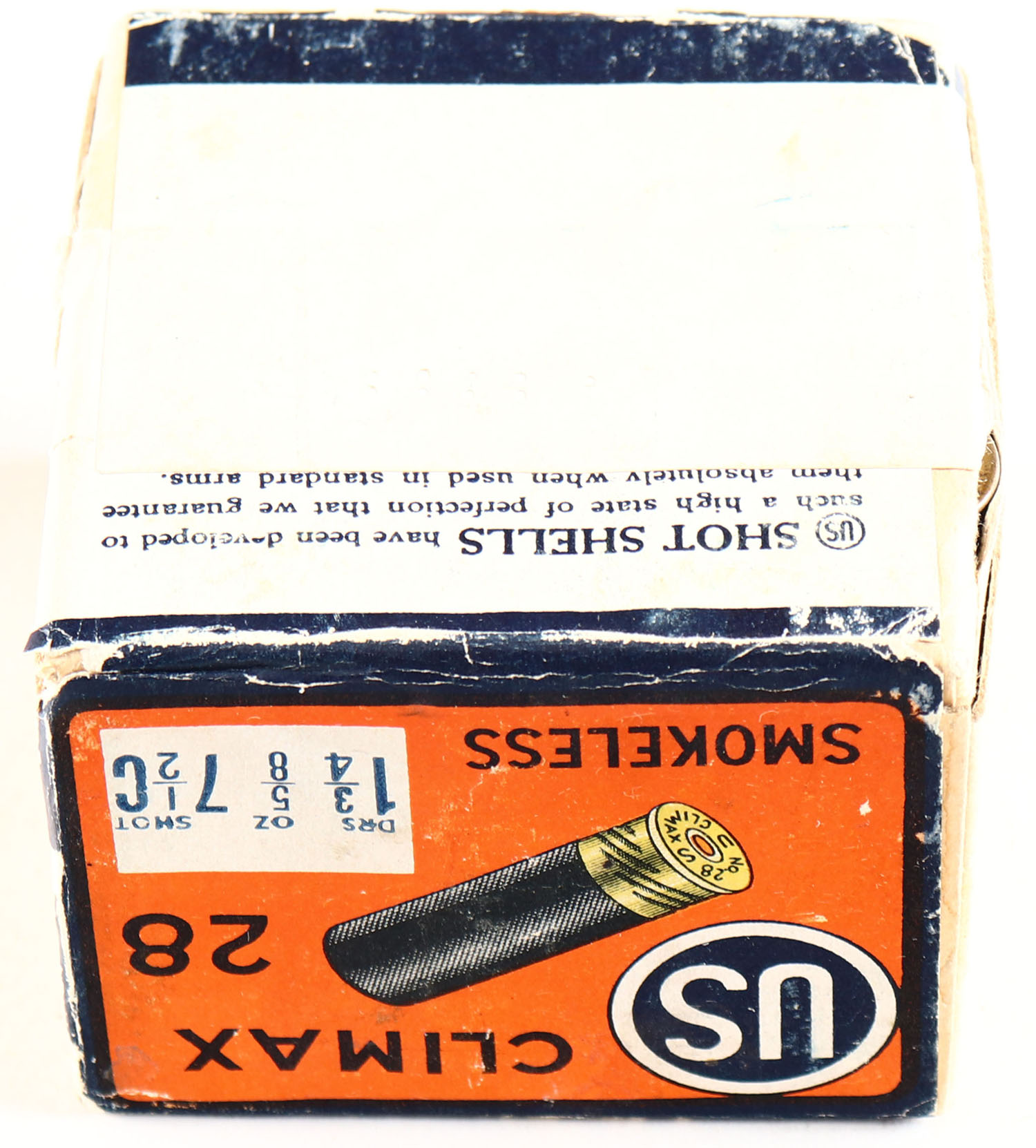US Cart. Co., Lowell, Mass., Climax, 28ga, 2pc., FULL & SEALED, shot size 7 1/2C, buff box orange, blue & white label, box has scuffing with minor shell protrusion to bottom, box is very solid with great colors. Grade: Very Good ++ - Value: 200 to 500