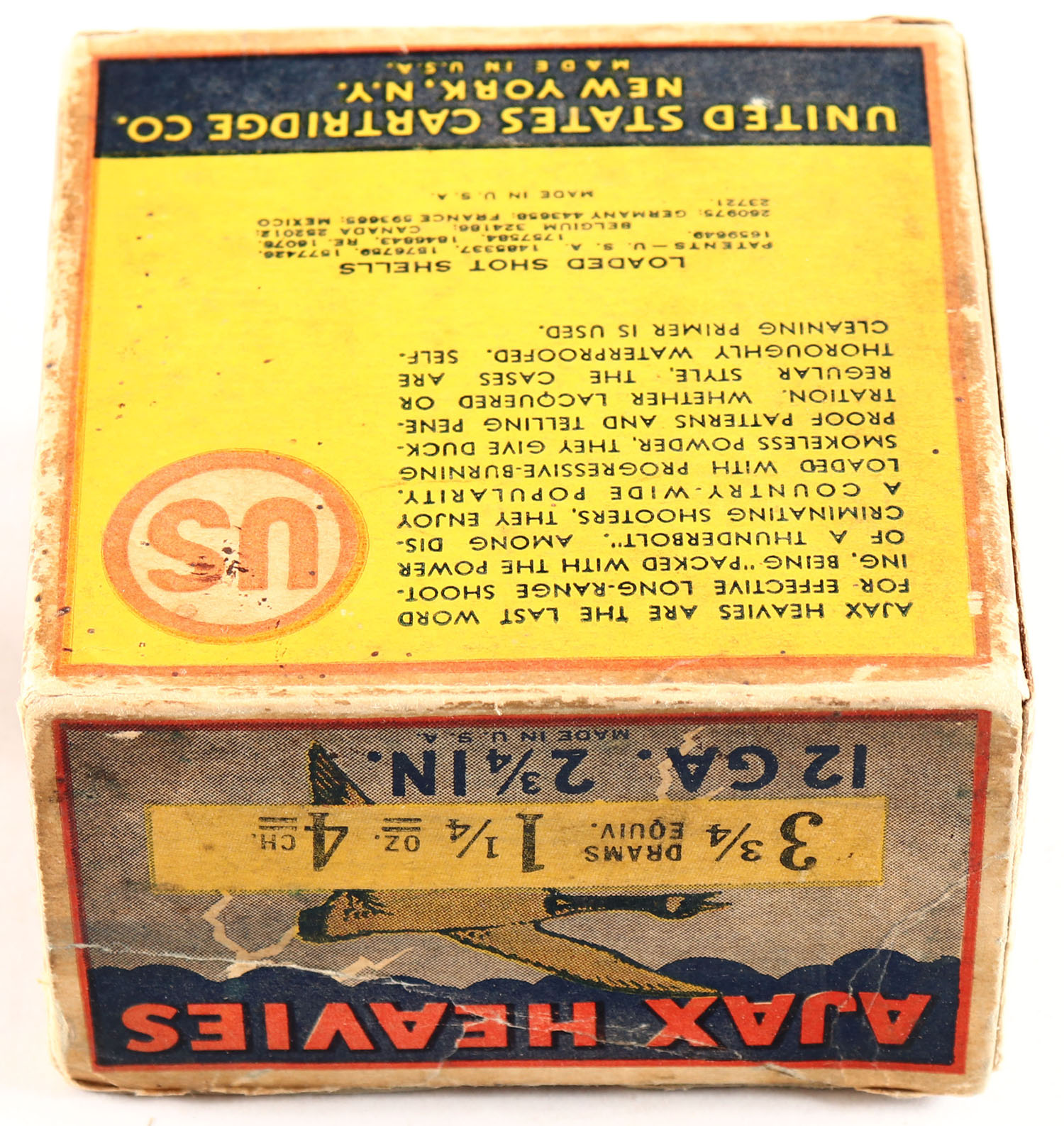 U.S. Cart. Co., AJAX HEAVIES, 12ga., 2 3/4'', 1pc., Empty, shot size 4 CH, multi colored box with three geese in lighting storm, box is solid with some age soiling & edgewear, box is nice with great colors. * Grade: Very Good ++ - Value: 500 to 1000