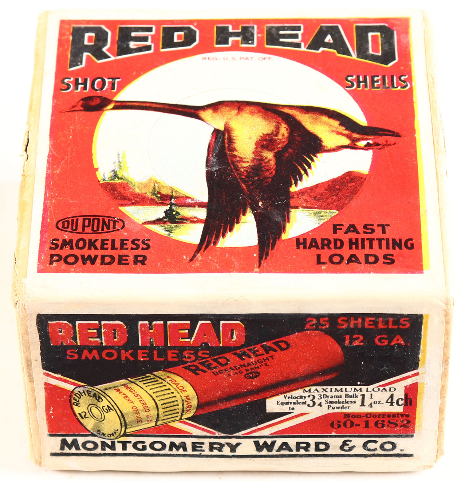 Montgomery Ward & Co., Red Head, DREADNAUGHT, 12ga., 2pc., FULL & SEALED, shot size 4ch, buff box with multi colored scene & single goose flying, box is very solid with great colors, box has minor shell protrusion. Grade: Excellent ++ - Value: 200 to 400