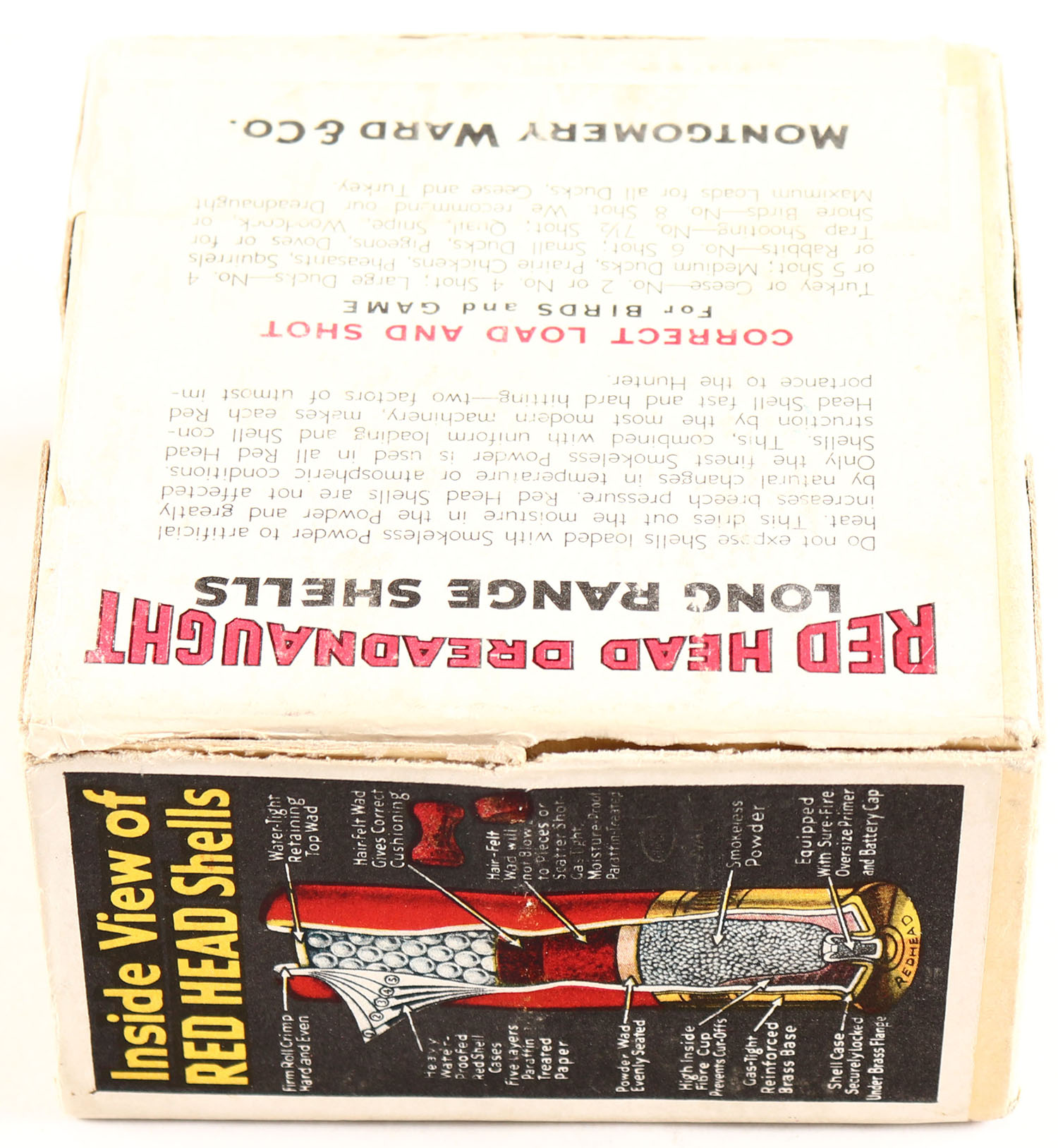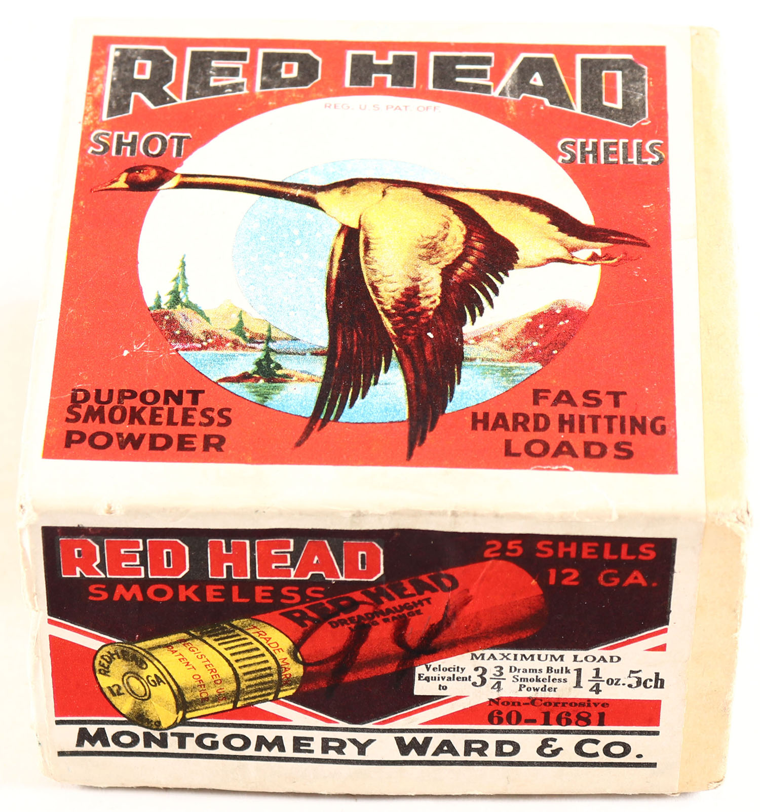 Montgomery Ward & Co., Red Head, DREADNAUGHT, 12ga., 2pc., Empty, shot size 5ch, buff box with multi colored scene & single goose flying, box is very solid with great colors. Grade: Excellent - Value: 60 to 180