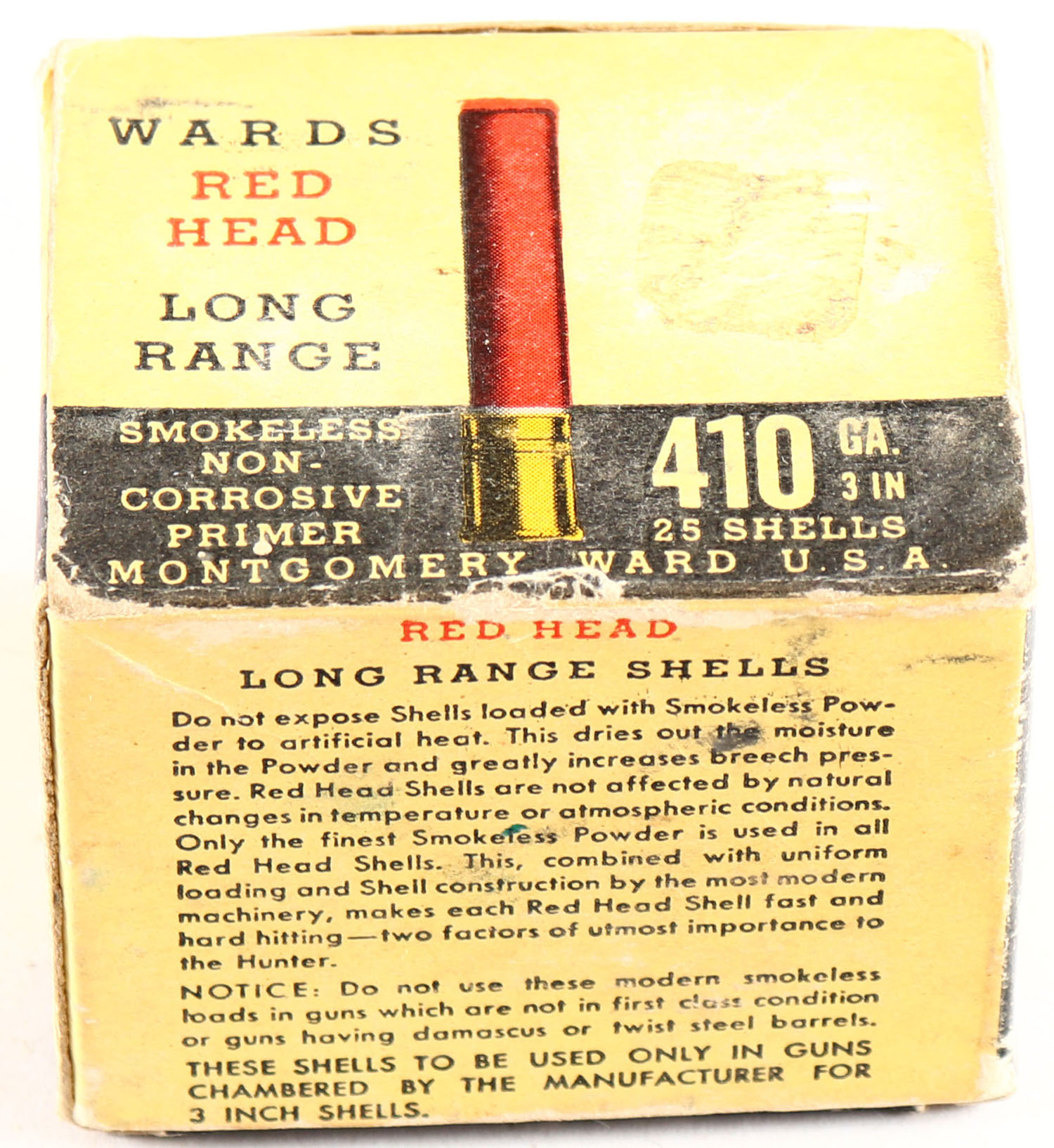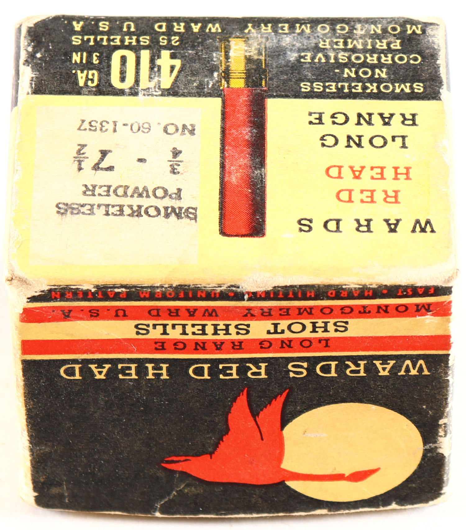 Montgomery Ward, Red Head, 410ga., 1pc., Full, shot size 7 1/2, black background with red goose flying through the moon, box has light scuffing with great colors, shells are very good. Grade: Excellent - Value: 40 to 100