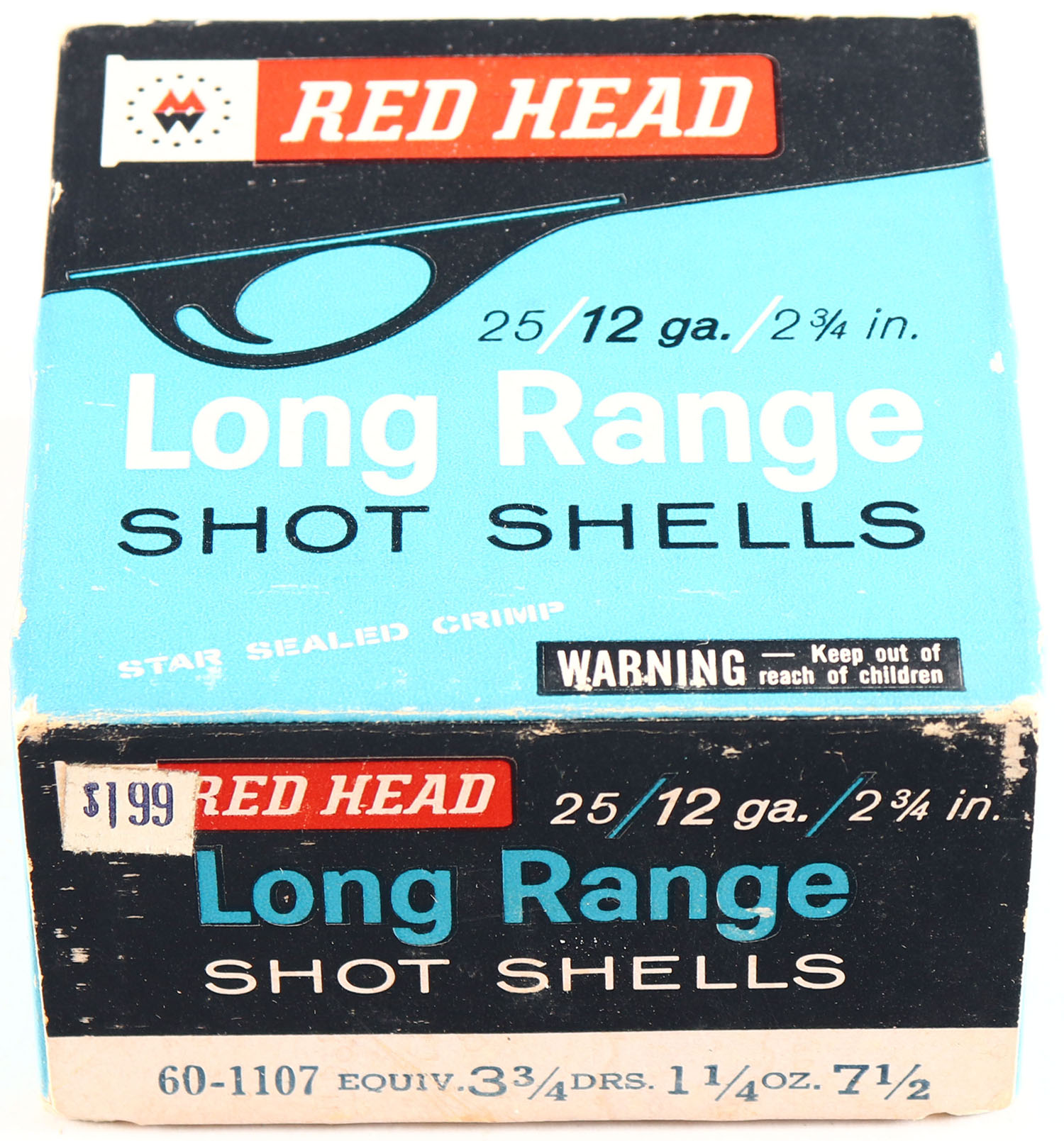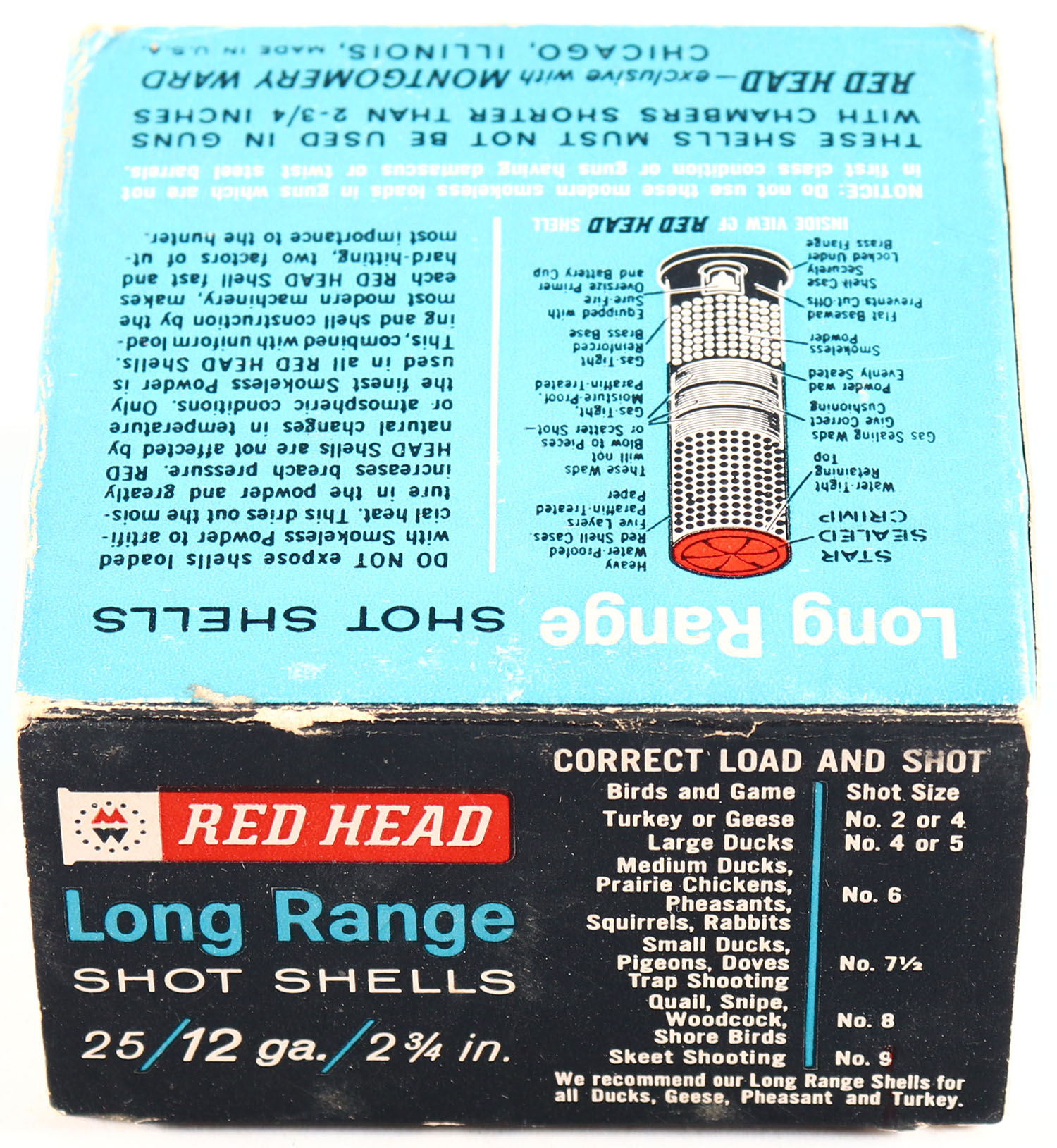 Montgomery Ward Red Head, 12ga., 1pc., Full, shot size 7 1/2, box is solid with very nice colors, shells are excellent. Grade: Excellent + - Value: 10 to 30