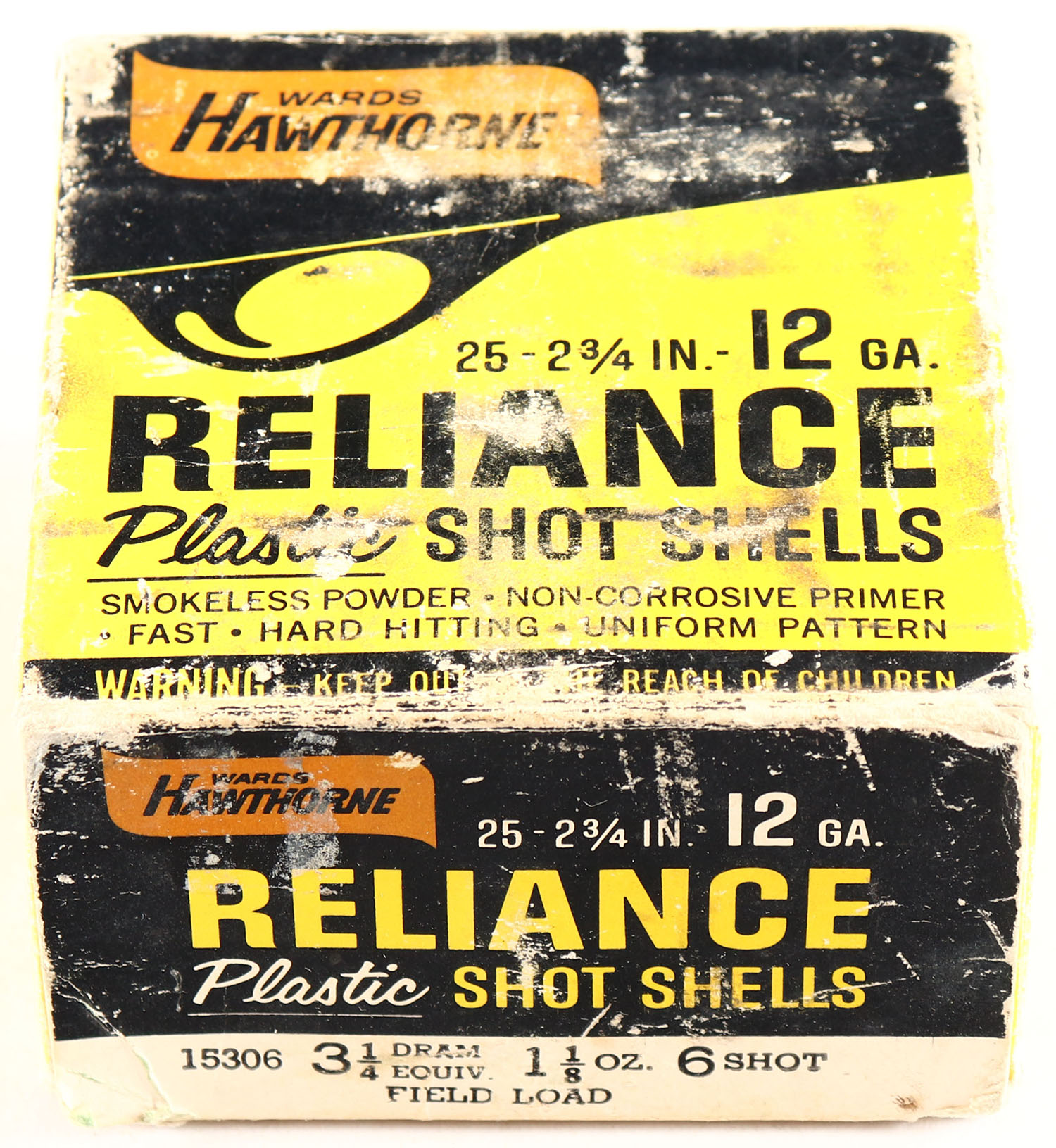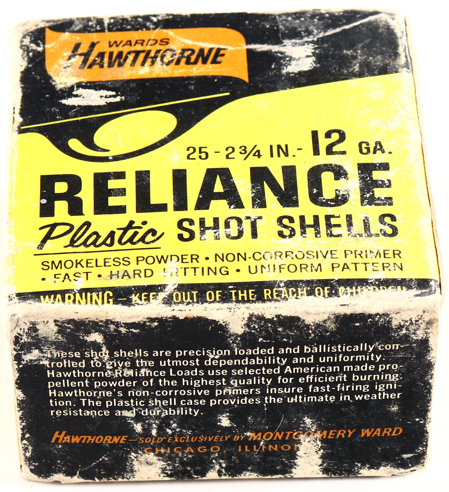 Wards Hawthorne, Reliance Plastic Shot Shells, 12 ga., 2 3/4'', 1pc., Full, shot size 6, box has age soiling with some scuffing, shells are excellent. Grade: Very Good + - Value: 10 to 30