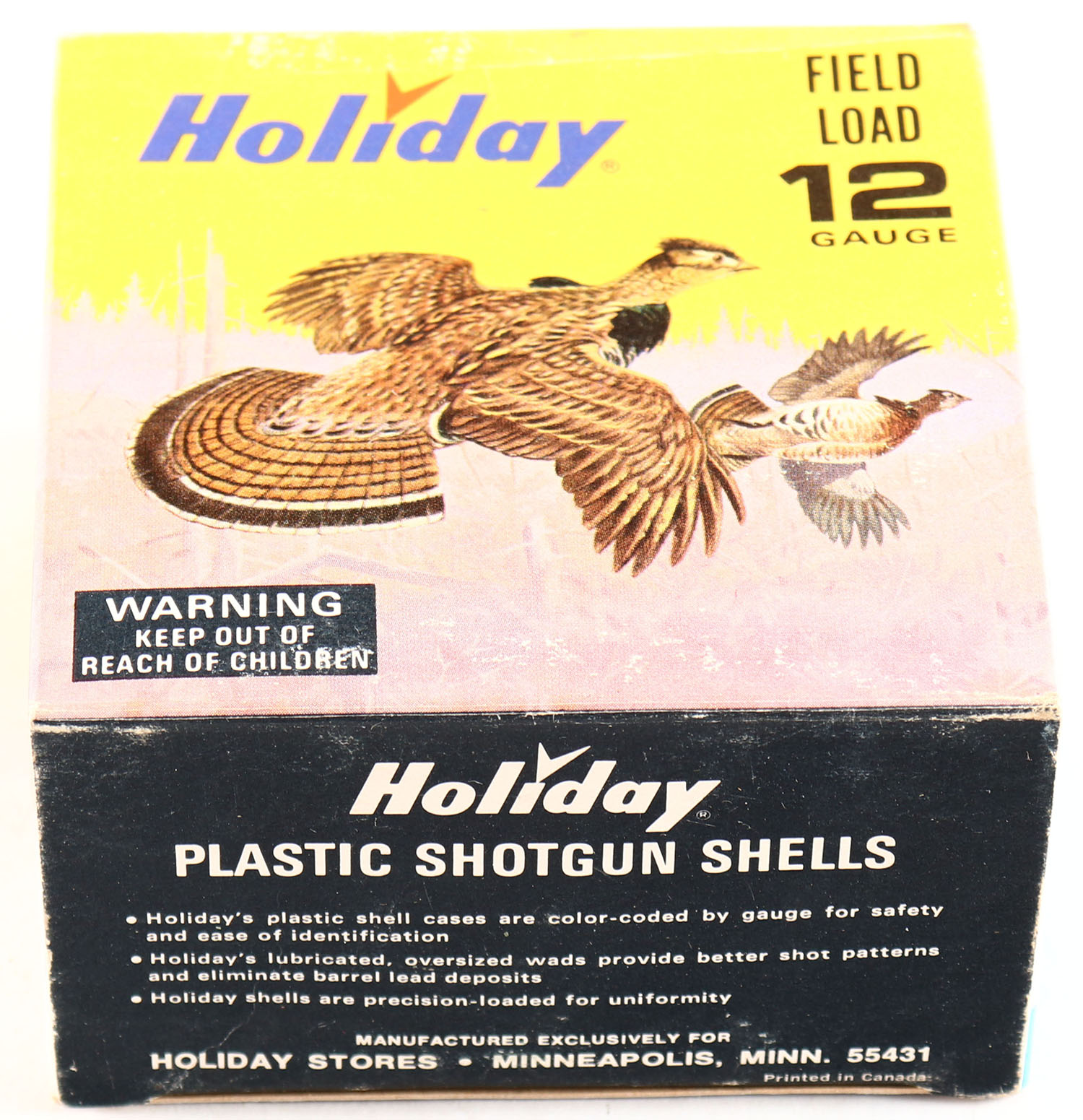 Holiday, Grouse/Rabbit Scene, 12ga., 1pc., Empty, 2 3/4'', shot size 8, multi color graphics of Grouse/Rabbit by Les Kouba, box is very solid with excellent colors. Grade: Excellent ++ - Value: 10 to 40