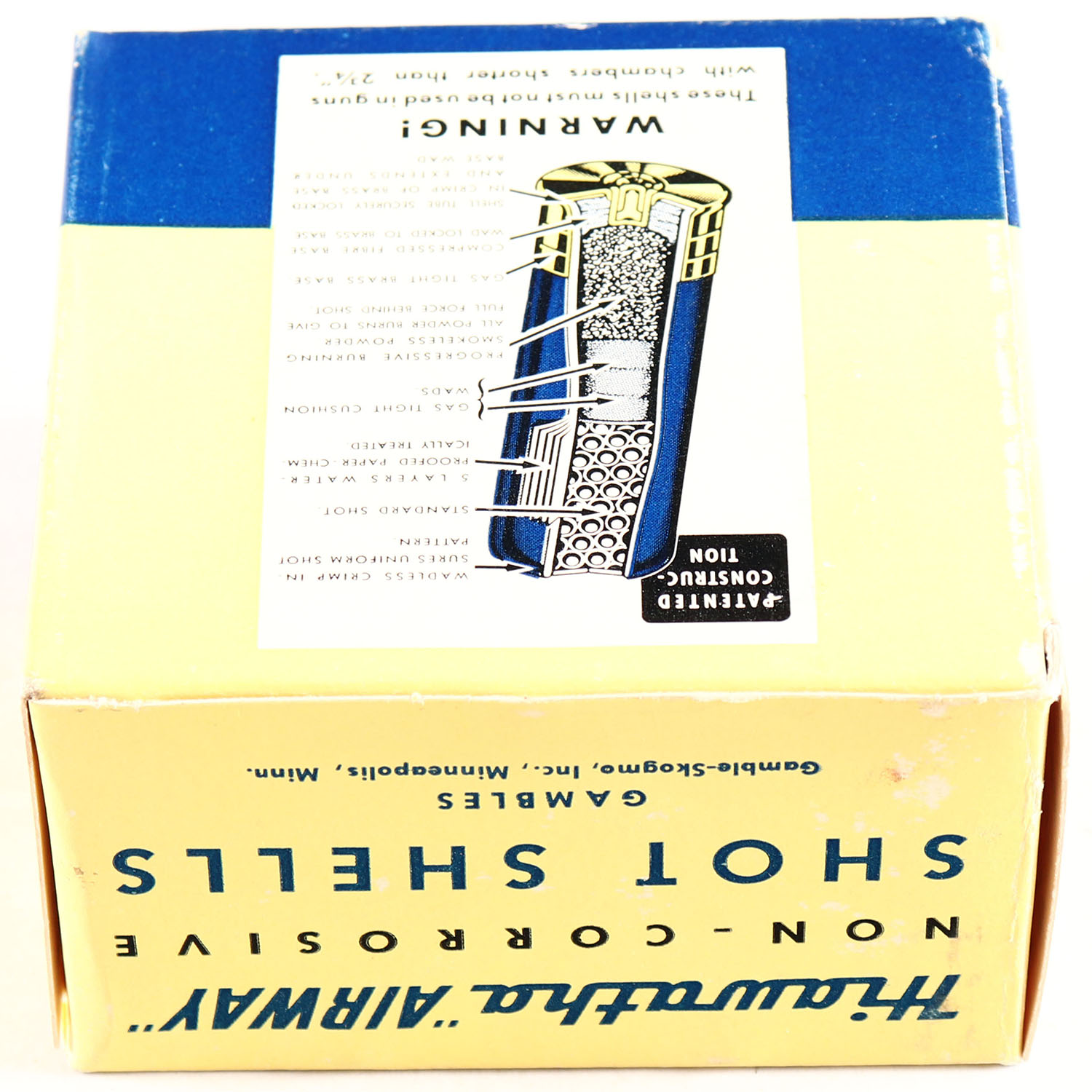 Gambles, Hiawatha Airway, 12ga., 1pc., Full, shot size 7 1/2, yellow, blue & white box, box is solid with very nice color, shells are excellent. Grade: Excellent ++ - Value: 40 to 100