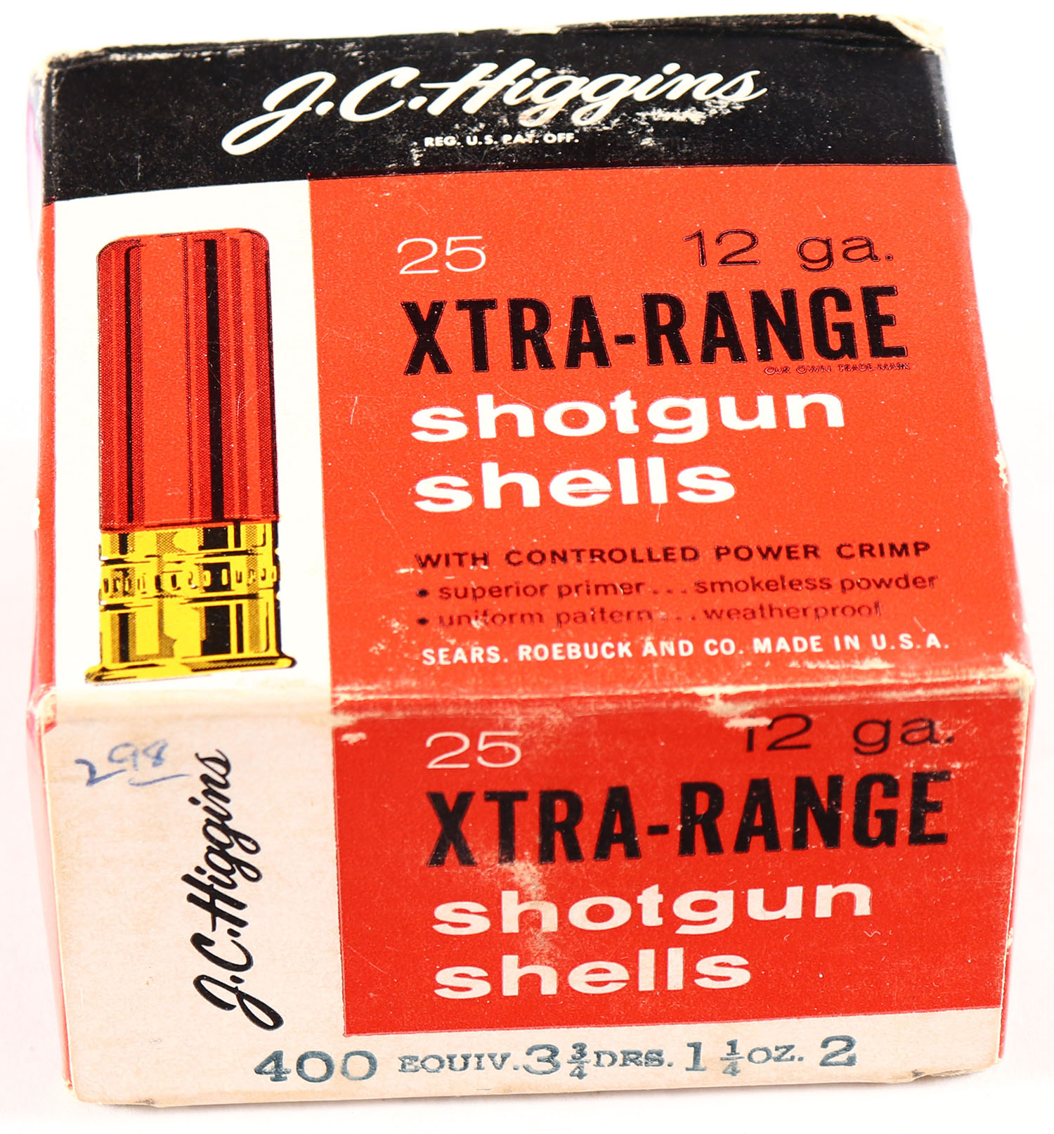 Sears, J.C. Higgins, Xtra-Range, 12ga., 1pc., Full, shot size 2, multi-colored box, box has light scuffing with great color, Shells are excellent. Grade: Very Good ++ - Value: 10 to 30