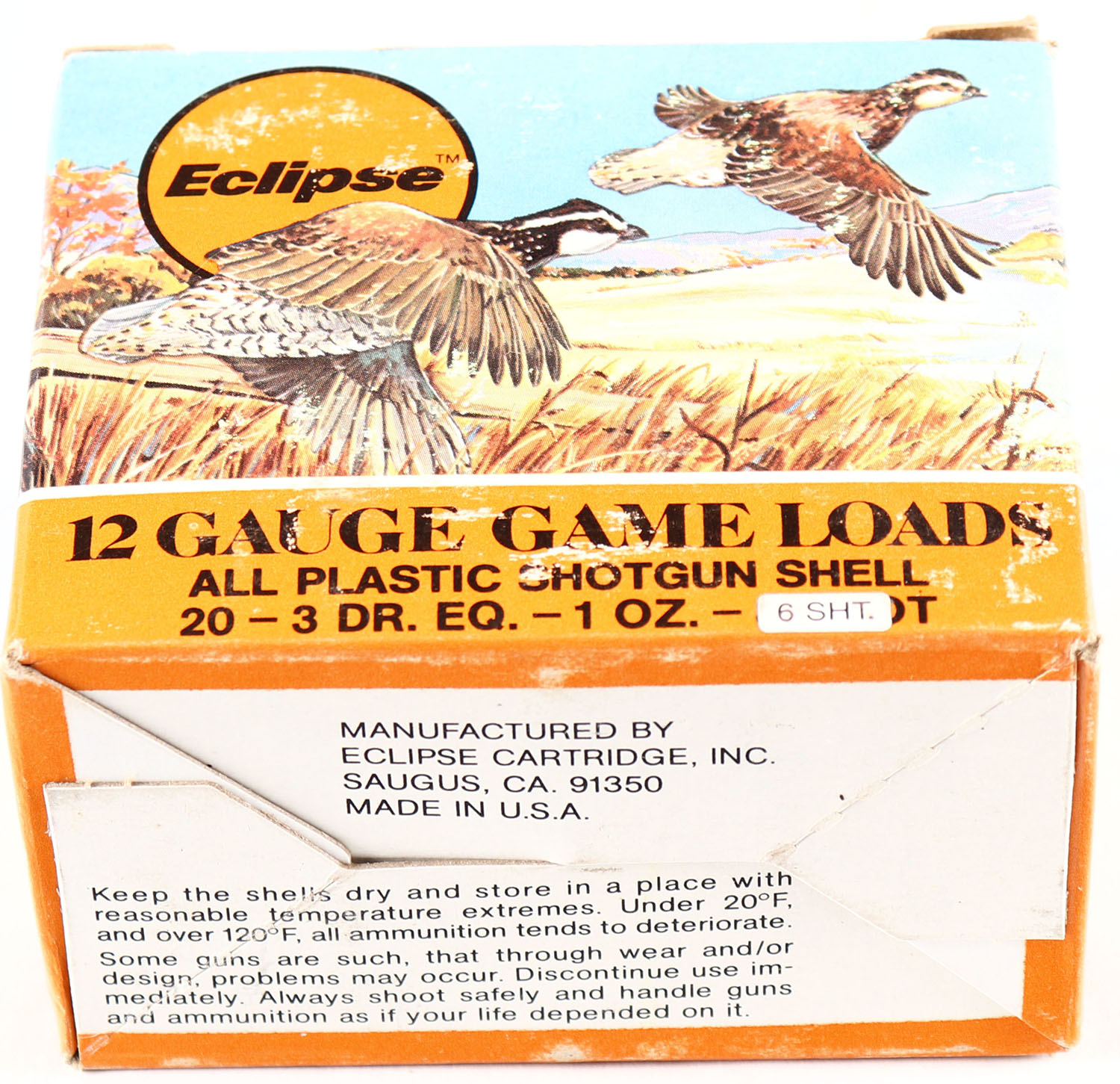 Eclipse, Game Loads, 12ga., 1pc., Full, shot size 6, multi-colored box, box is very solid, shells are excellent. Grade: Very Good ++ - Value: 10 to 20