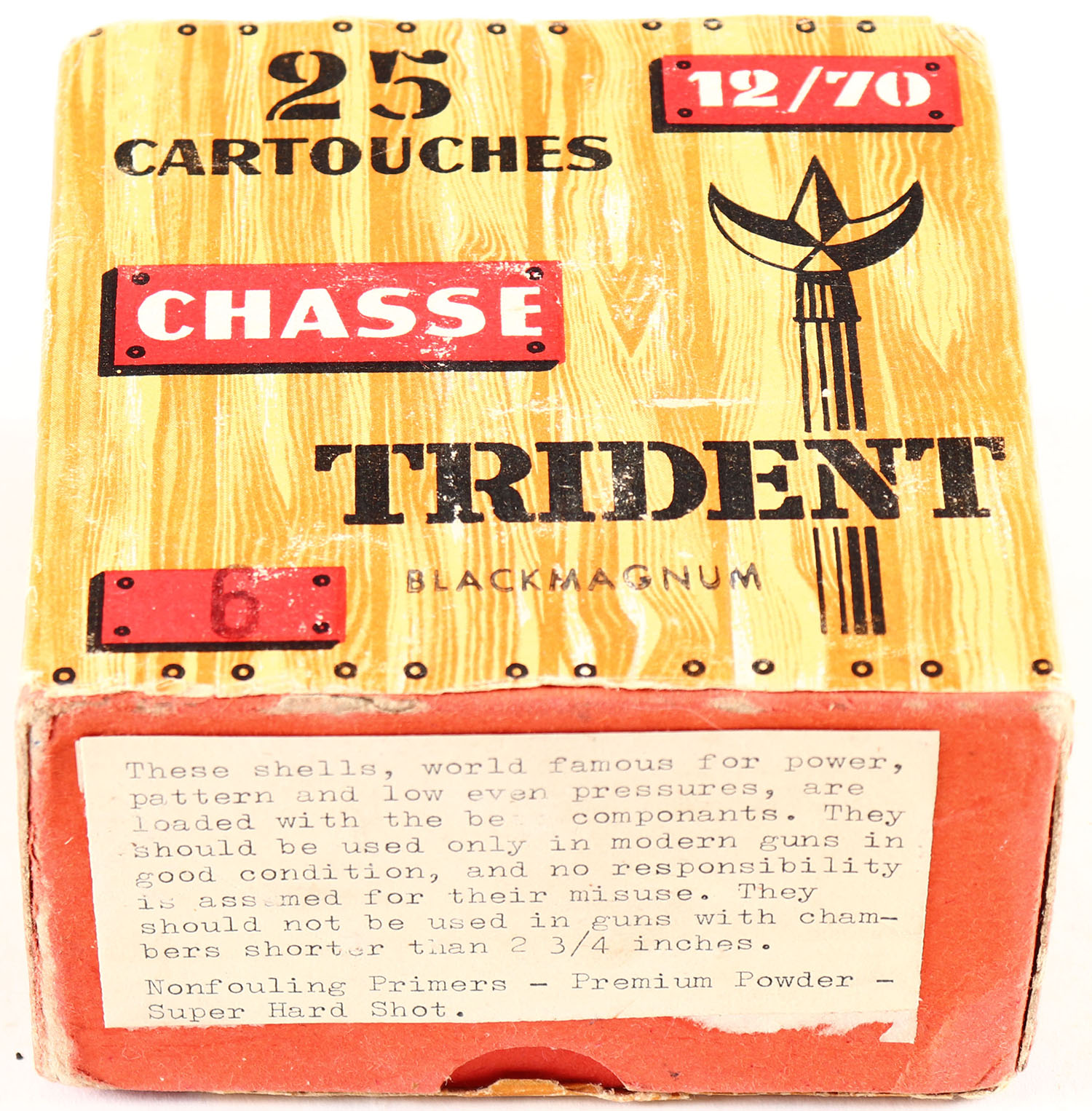 Chasse, Trident, 12ga., 2 pc., Full, shot size 6, multi-colored box, shells are excellent. Grade: Very Good ++ - Value: 10 to 30