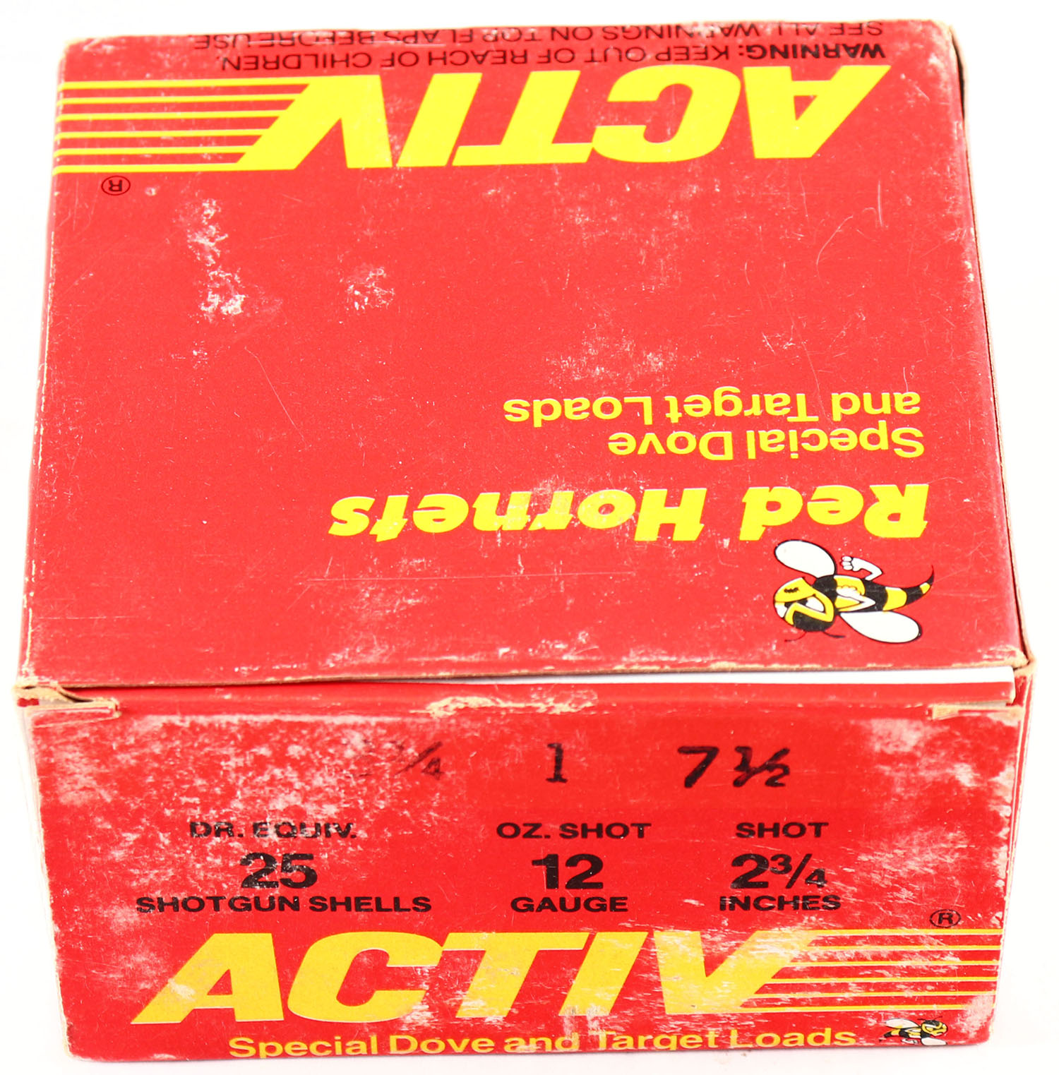 Activ, Red Hornets, 12ga., 1pc., Full, shot size 7 1/2, box is very solid, shells are excellent. Grade: Very Good ++ - Value: 10 to 20