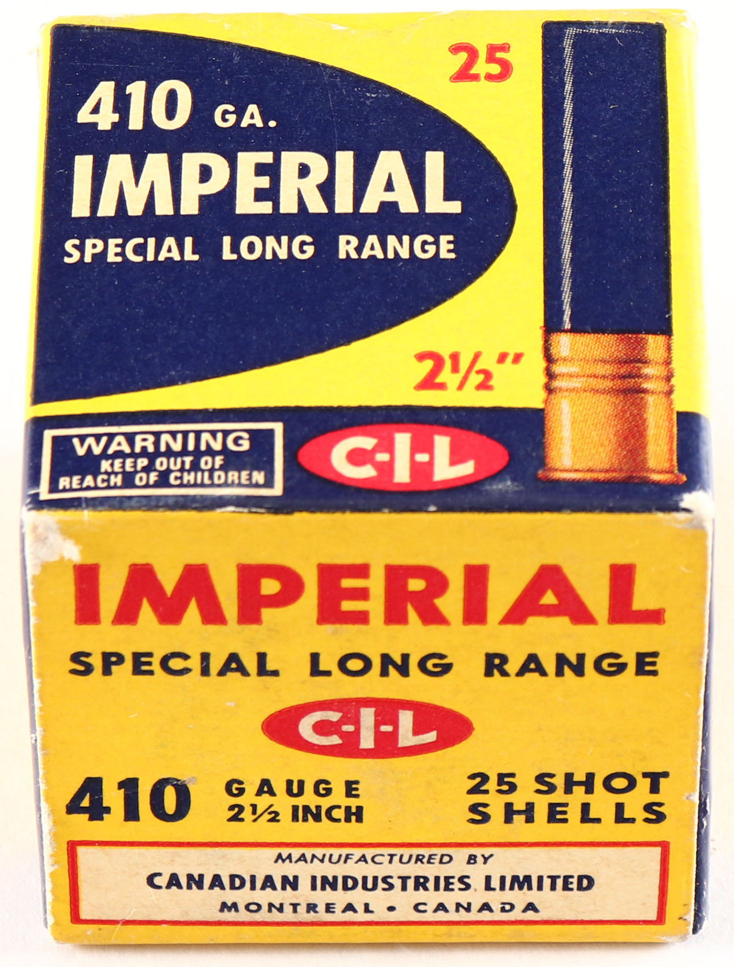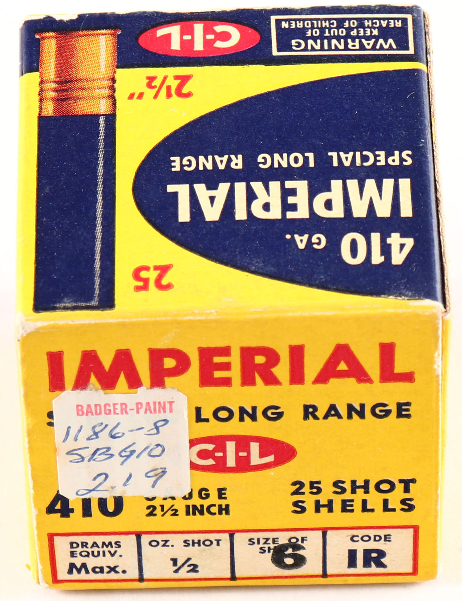 CIL, Imperial, 410ga., 1pc., Full, shot size 6, box is solid with great colors, Shells are excellent. Grade: MINT - Value: 10 to 30