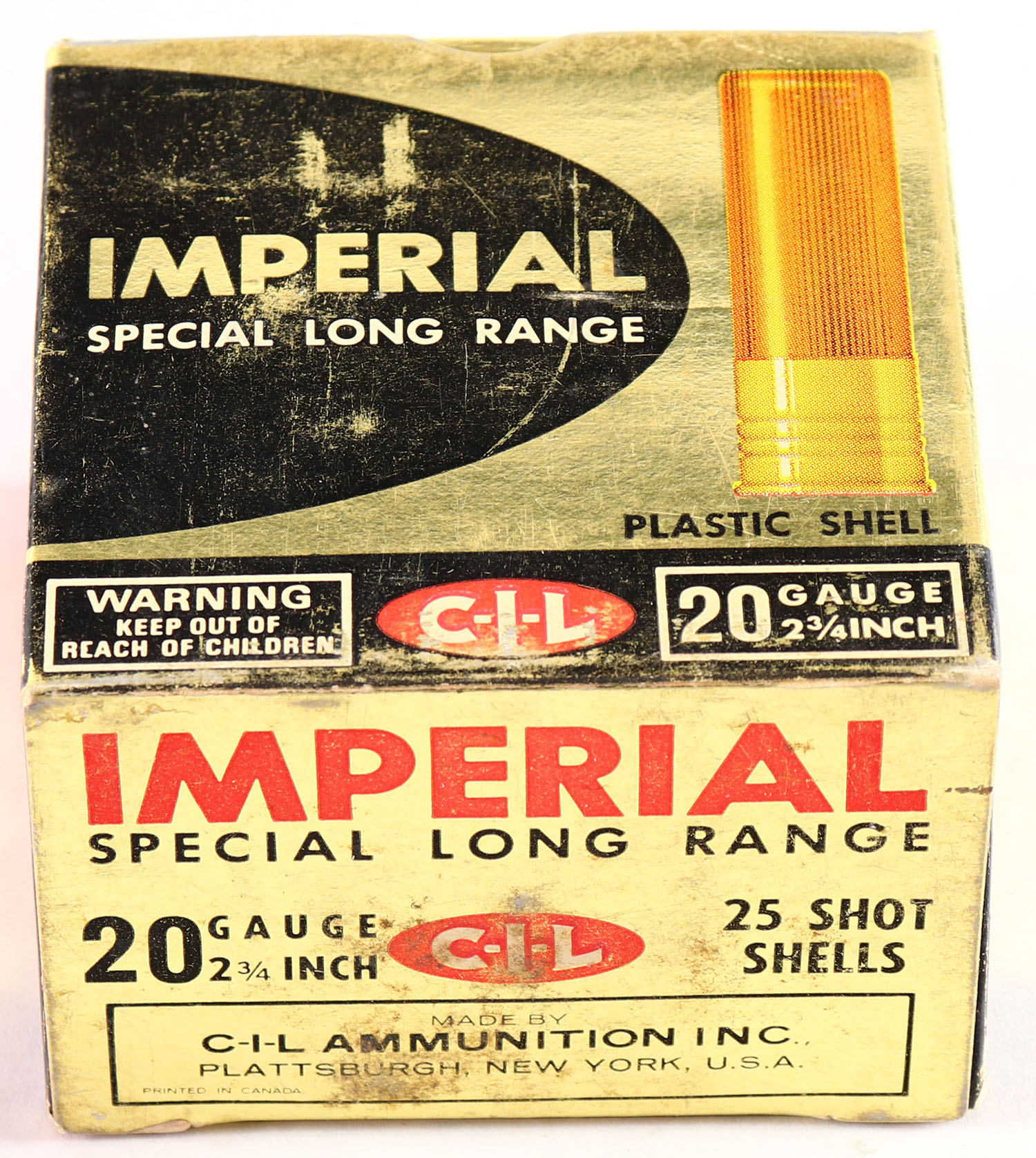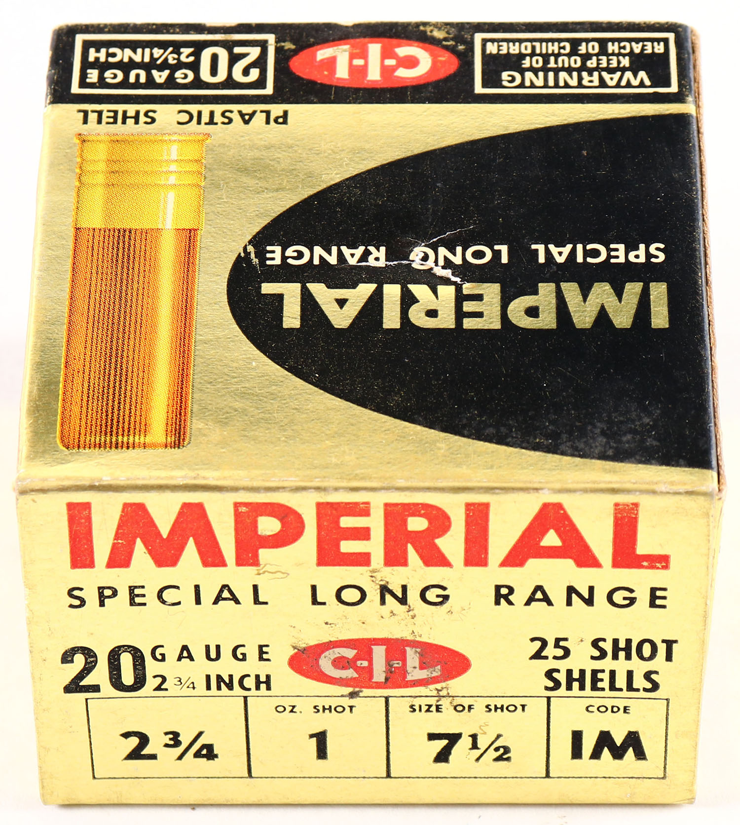 CIL, Imperial, 20ga., 1pc., Partial 24rds., shot size 7 1/2, multi-colored box, box is solid with very nice colors, Shells are excellent. Grade: Excellent - Value: 10 to 30