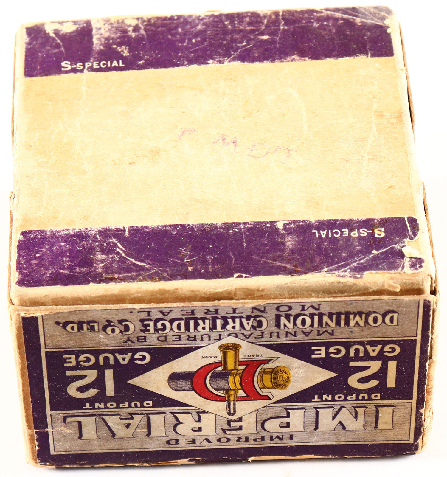 Dominion Cartridge Co, IMPERIAL, 12ga., 2pc., Empty, shot size 6, has early Bent D Logo, OVER LABEL ''SPECIAL LONG RANGE LOAD'', box is solid with age soiling to label. Grade: Very Good ++ - Value: 50 to 500