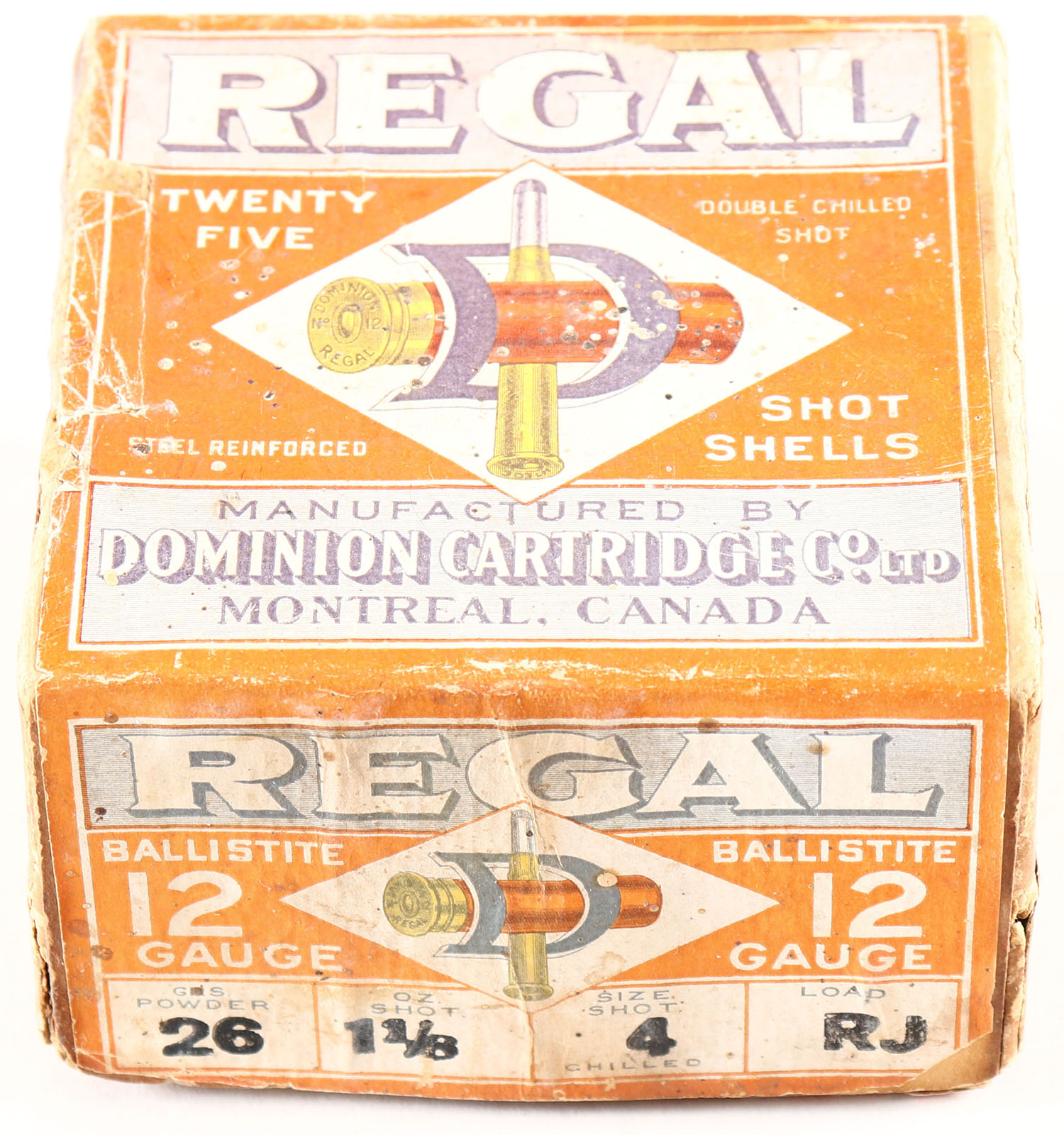 RARE Dominion Cartridge Co., REGAL, 12ga., 2pc., Empty, shot size 4CH, has early Bent D Logo, box is solid with good color to label, box has soiling & scuffing. Grade: Very Good + - Value: 100 to 500