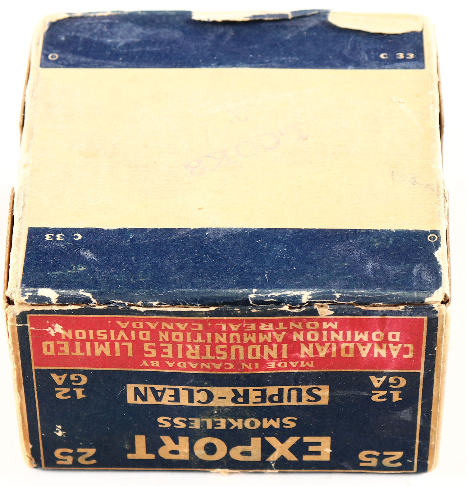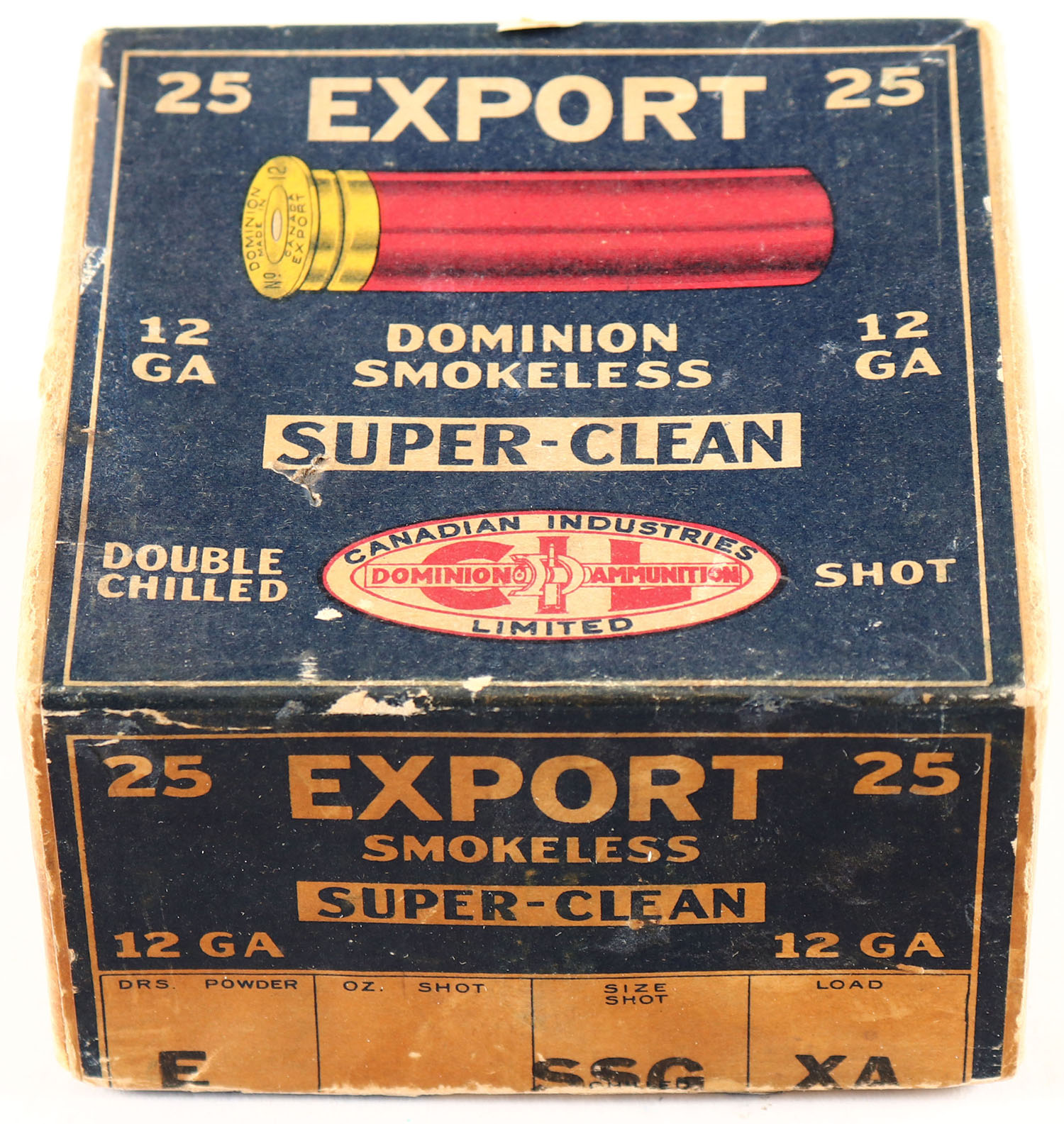 RARE Dominion Cartridge Co, EXPORT, 12ga., 2pc., Empty, shot size SSG CH., box is solid with great color to label, box has light scuffing. Grade: Excellent - Value: 50 to 500