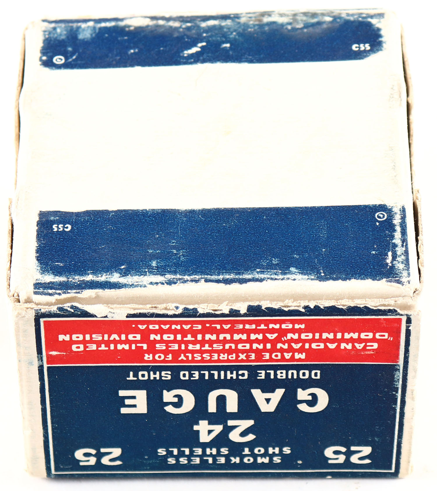 CIL, 24 GAUGE, 24ga., 2pc., Empty, shot size 6, buff box with good color to label, box has scuffing & light soiling. VERY RARE IN 24 GAUGE! Grade: Very Good ++ - Value: 50 to 400