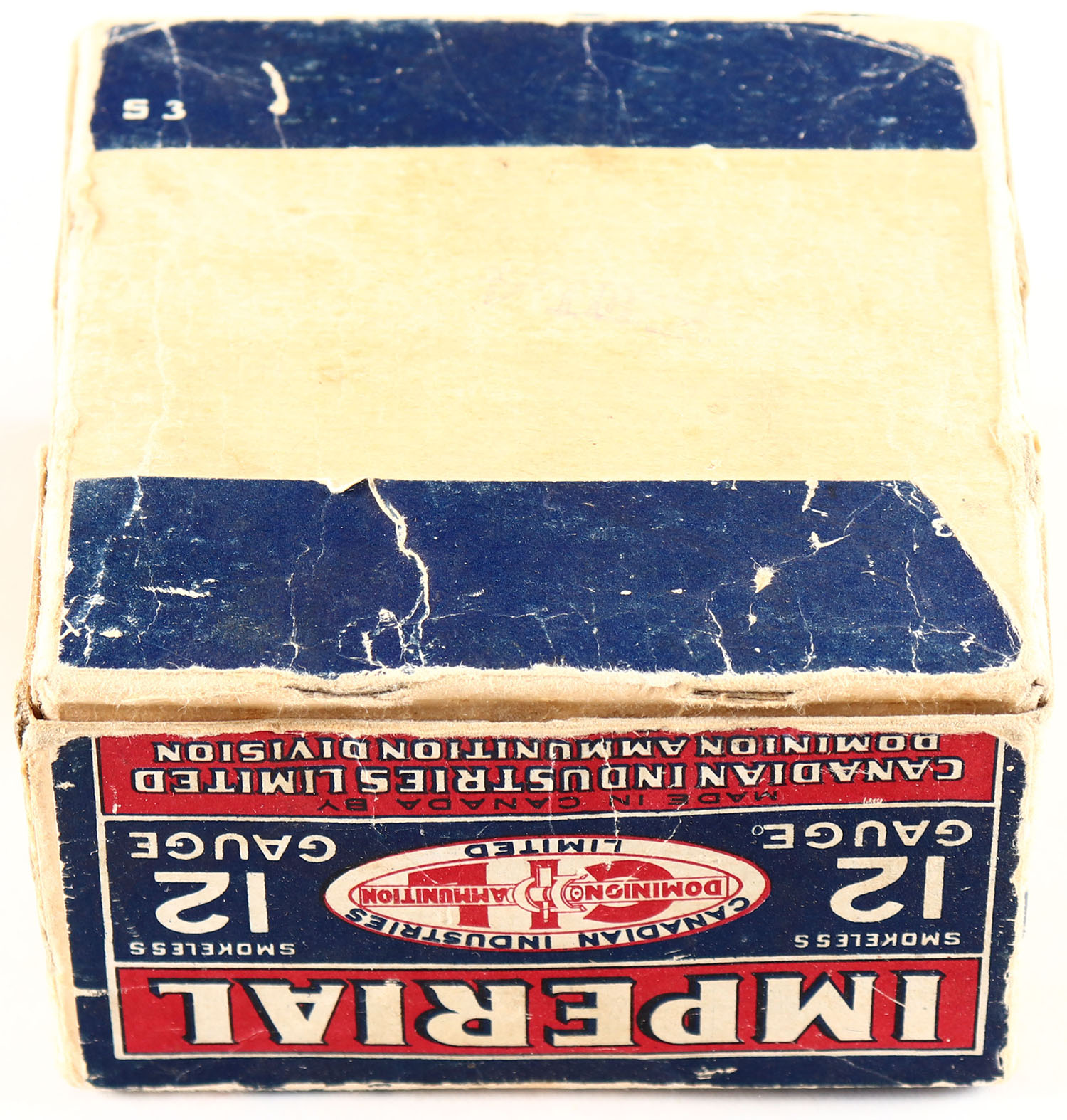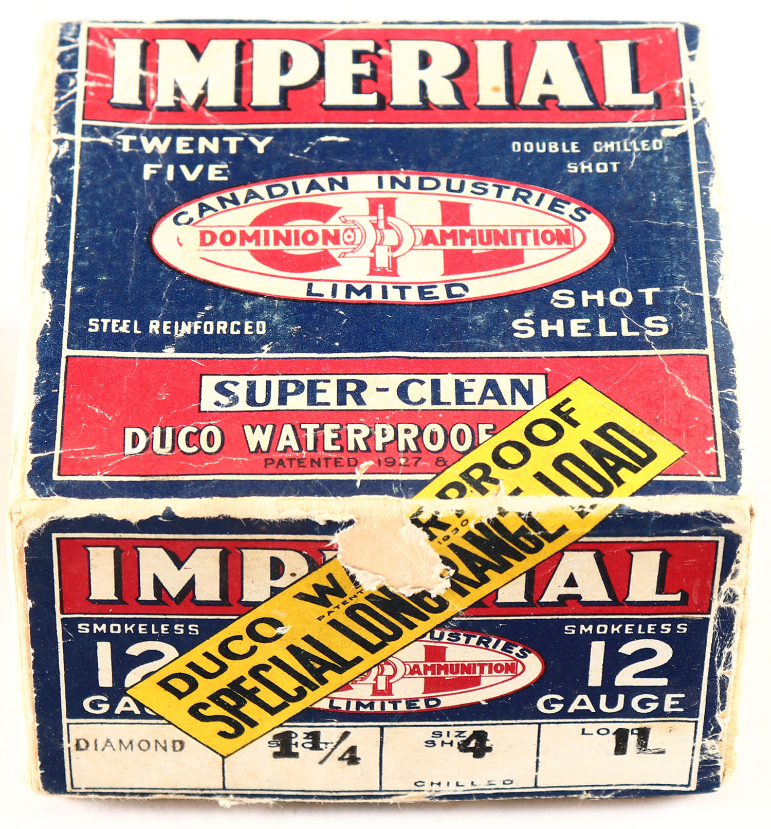 Dominion Cartridge Co, IMPERIAL, 12ga., 2pc., Empty, shot size 4CH, has early Bent D Logo, OVER LABEL ''DUCO WATERPROOF SPECIAL LONG RANGE LOAD'', box is solid with age soiling & scuffing. Grade: Very Good ++ - Value: 50 to 500
