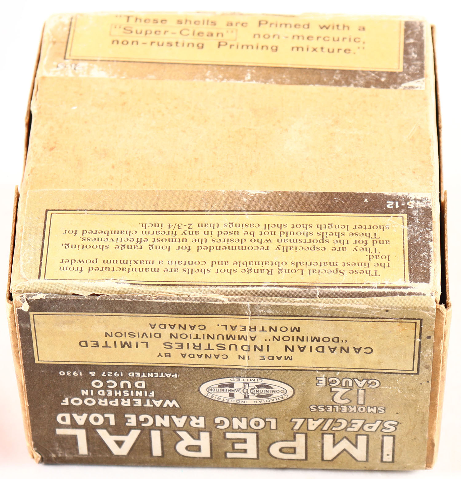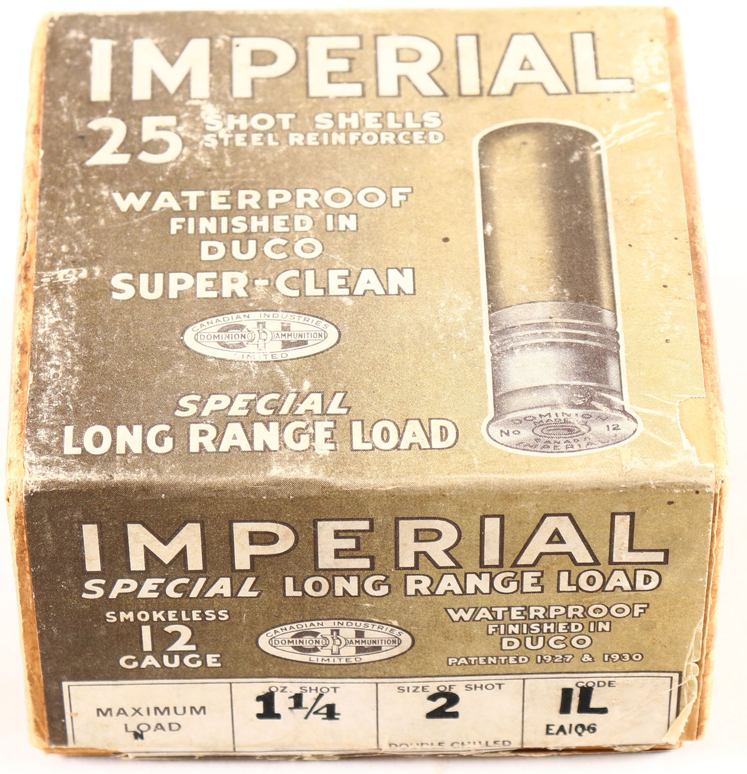 RARE Dominion Cartridge Co, Imperial, 12ga., 2pc., Empty, shot size CH., box is very solid with great color to label, box has soiling and scuffing. Grade: Very Good ++ - Value: 100 to 300