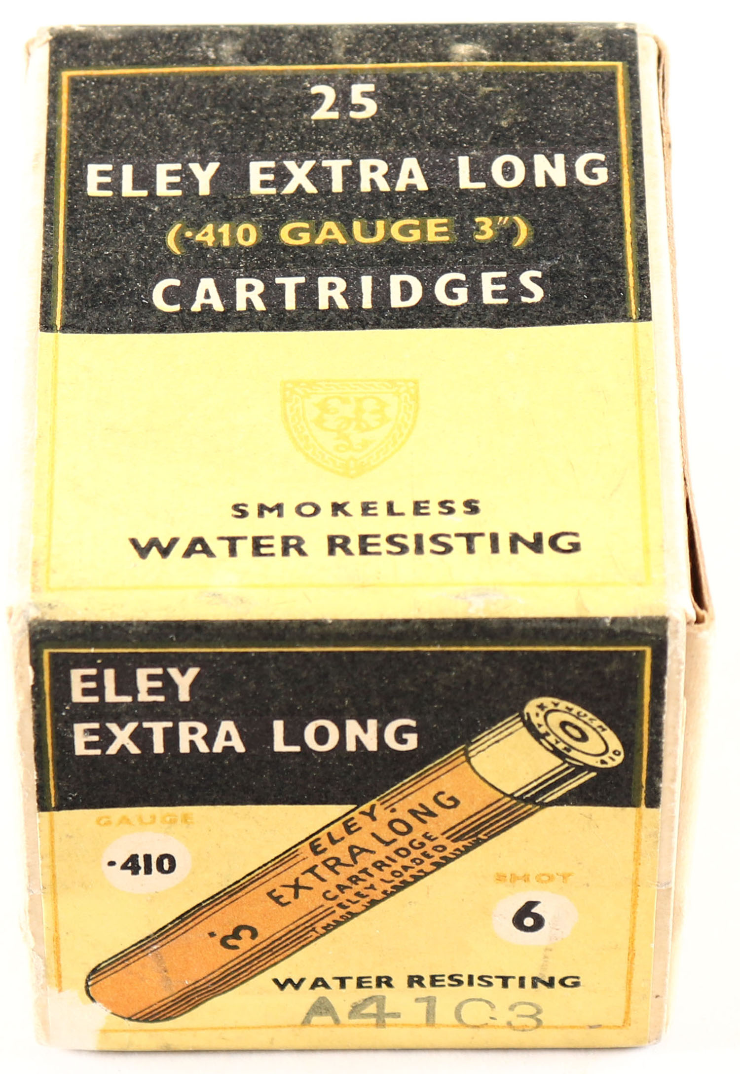 Eley, 410ga., 1pc., FULL & SEALED, 3'', buff box with yellow & black label, box has age soiling & light scuffing. Grade: Excellent + - Value: 20 to 100