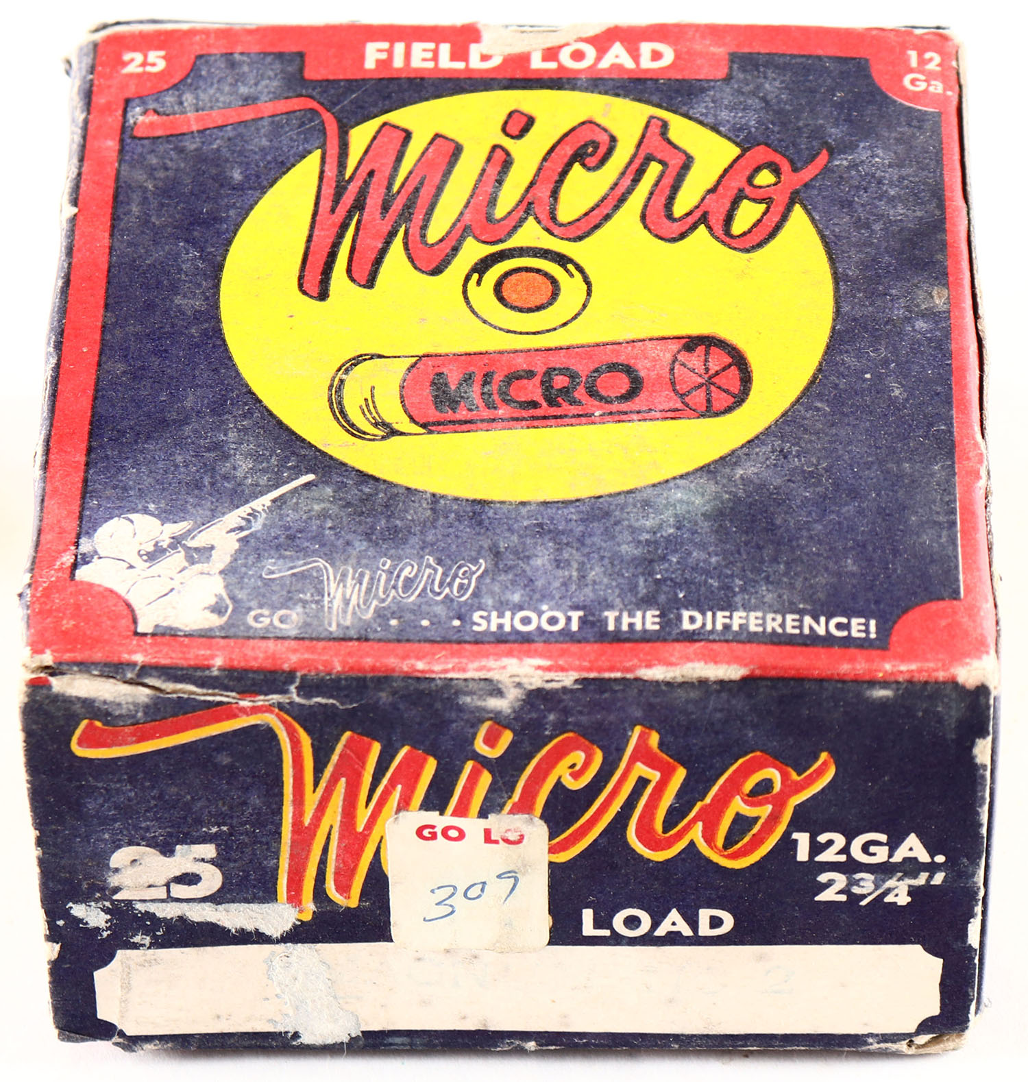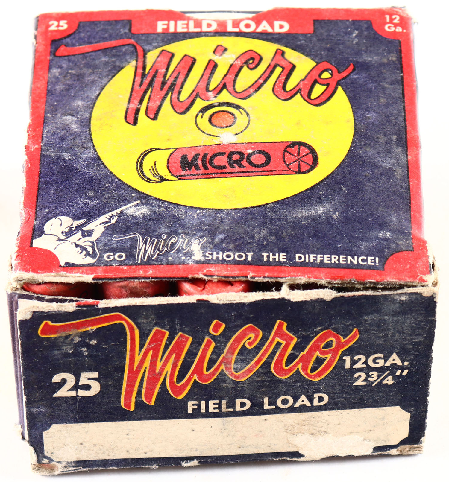 Micro, Field Load, 12ga., 1pc., Full, Magnum Game Load, multi-colored box, box has scuffing and soiling, shells are good. Grade: Good ++ - Value: 10 to 20
