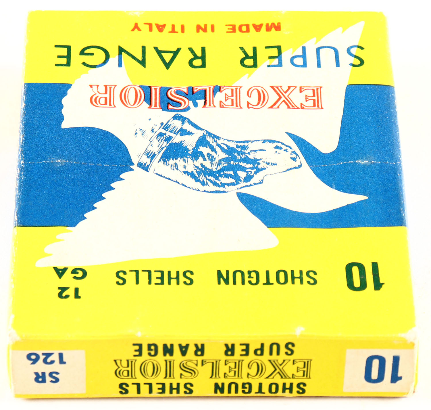 Excelsior, Super Range, 12ga., 1pc., Full, shot size 6, box is solid with great colors, shells are excellent. Grade: Excellent + - Value: 10 to 30