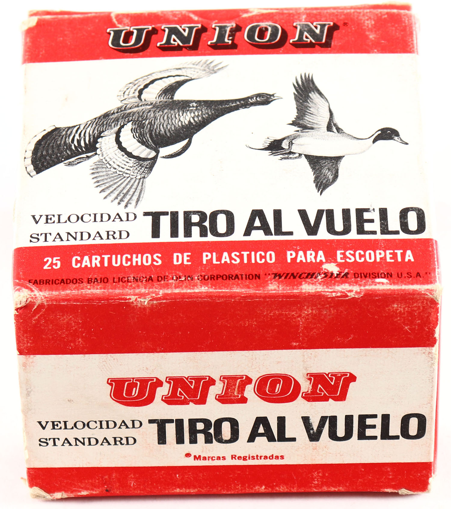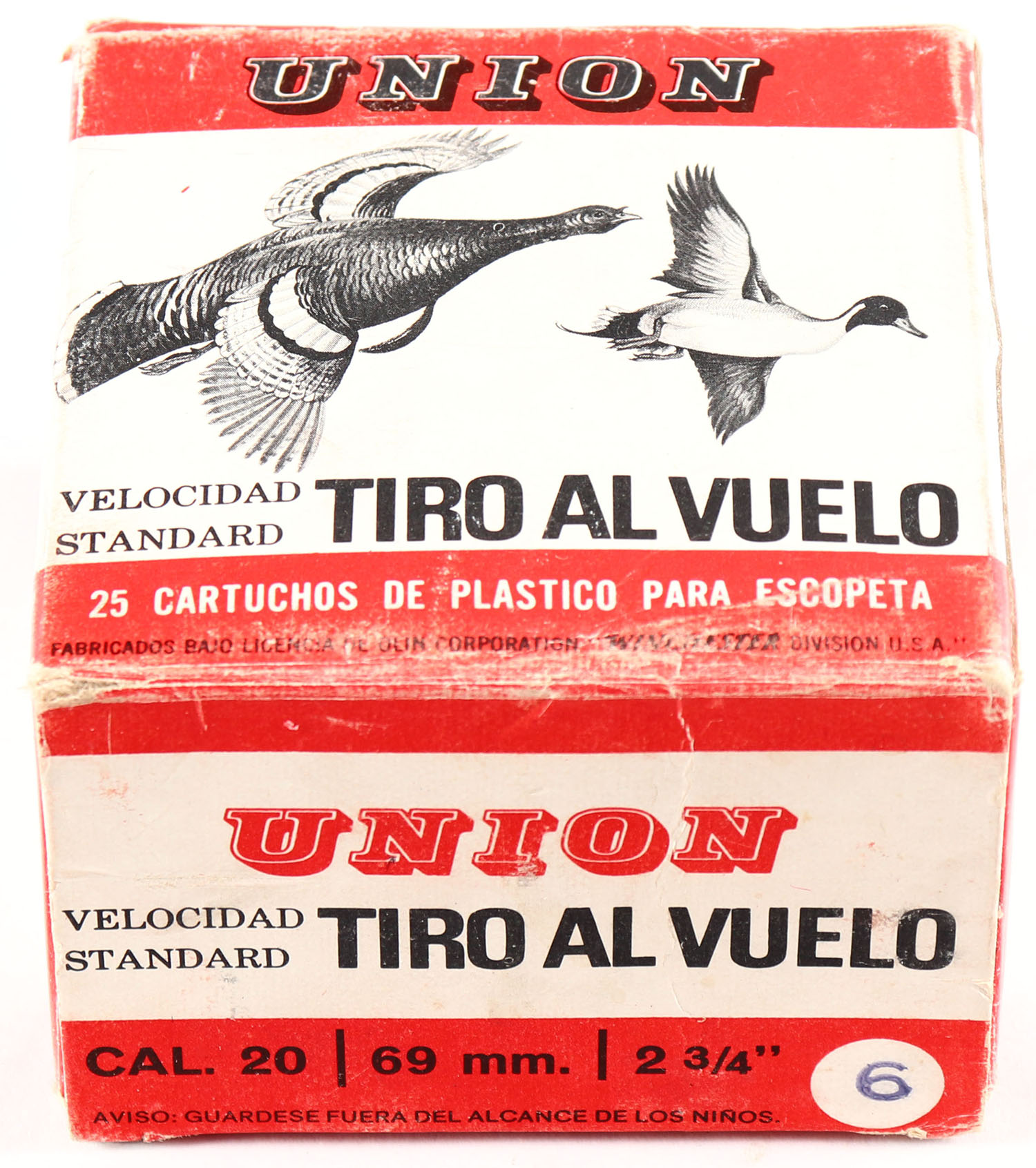 Winchester, UNION, ''Tiro al vuelo'', 20ga., 1pc., Full, multi-colored box, shot size 6, box is solid with very nice colors, Shells are very good. Grade: Excellent - Value: 10 to 40