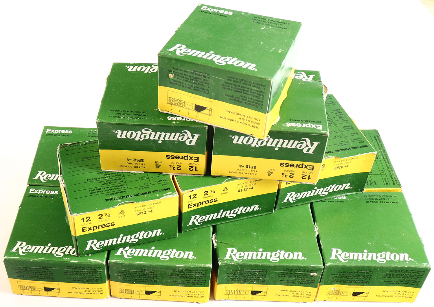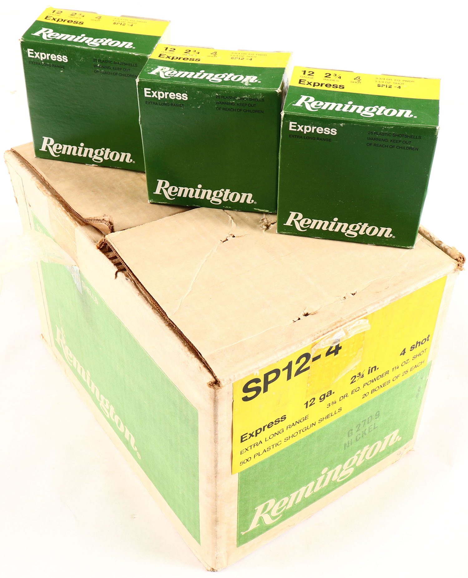 Partial Case of Remington, Express, 12ga., 1pc., Full, shot size 4, 350rds, multi-colored box, box is very solid, shells are very good. Grade: Excellent - Value: 50 to 150