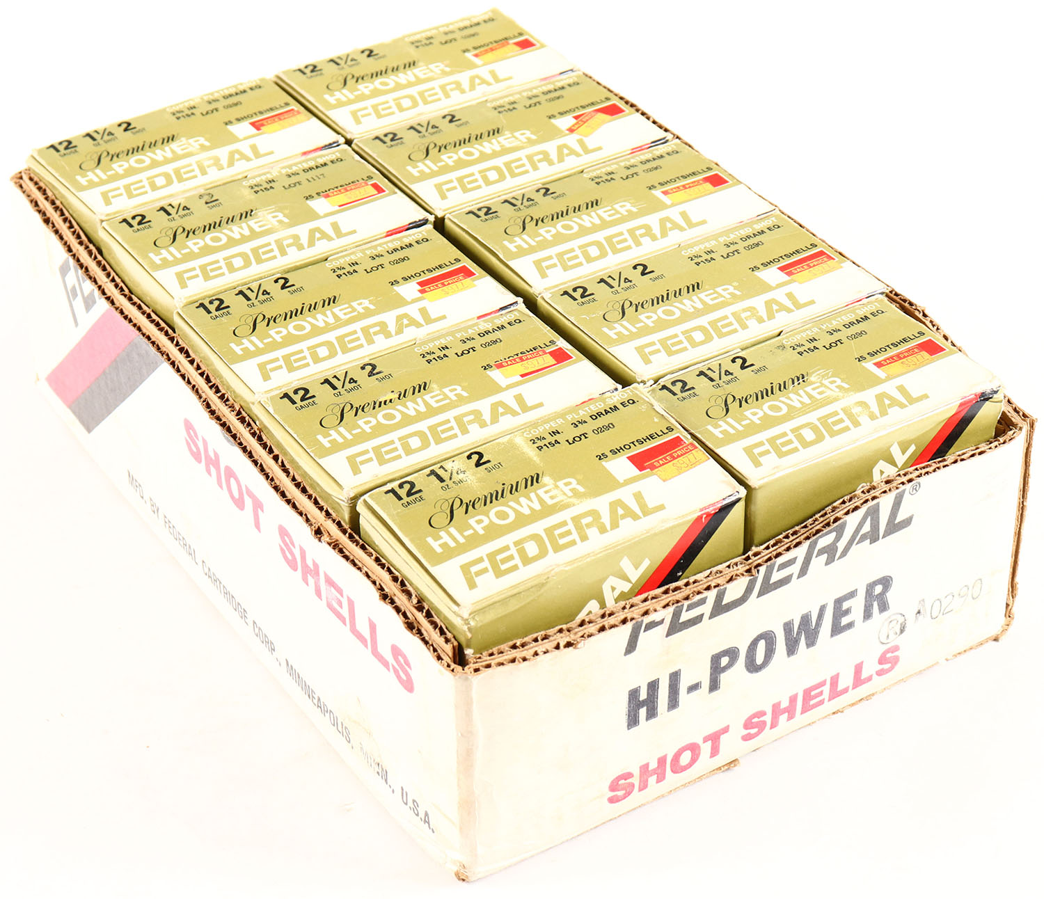 Federal, Premium Hi- Power, 12ga., 1pc., Full case of 10, 250 rds., shot size 2, case is solid, inside boxes are very good, shells are excellent. Grade: Excellent - Value: 50 to 150