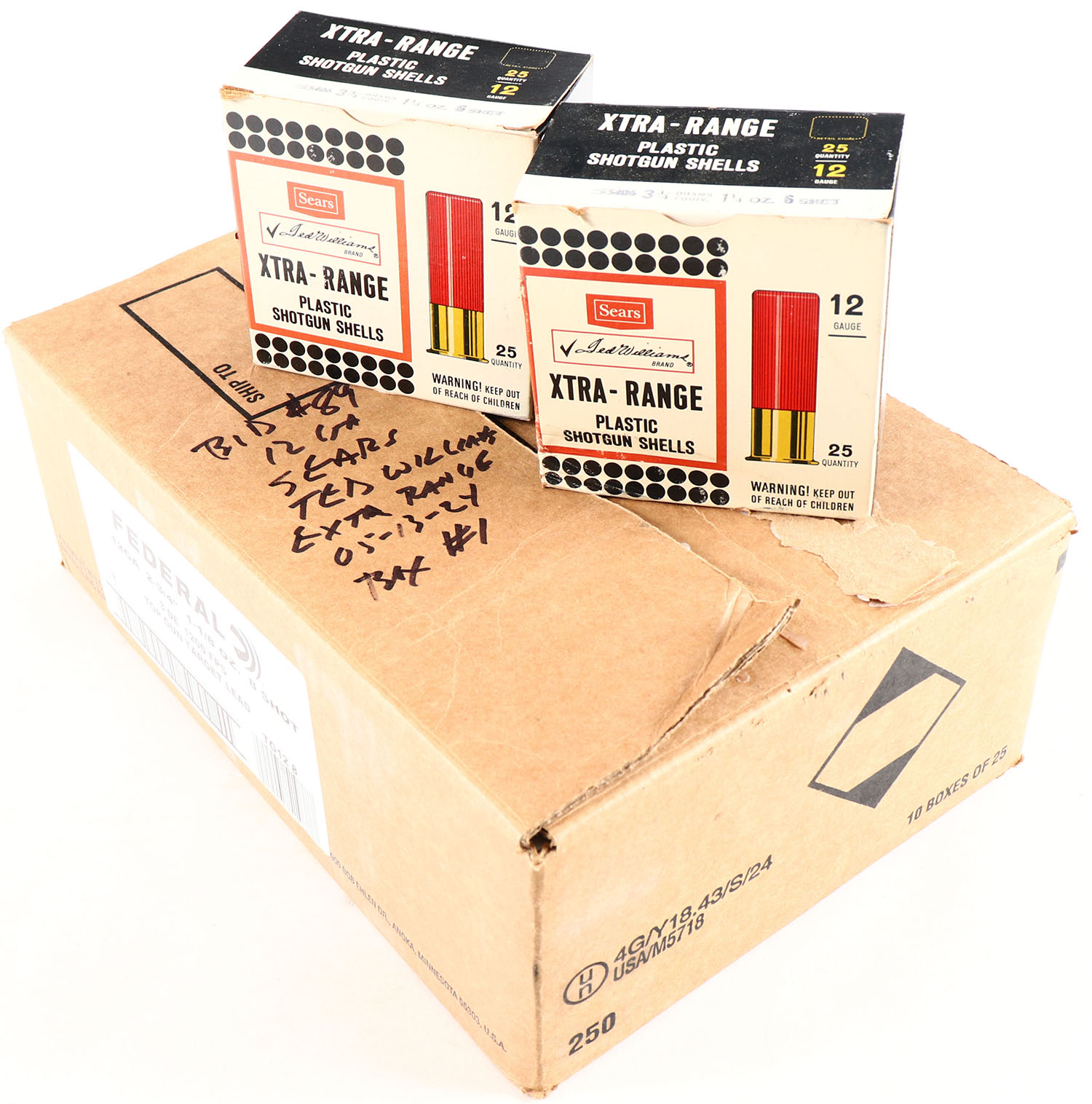 Sears, Xtra-Range, 12ga., 1pc., Full of 12ga, case of 10 boxes, 250rds., 5 boxes of shot size 6, 5 boxes of shot size 4 , IGNORE WHAT THE CASE SAYS - there are only Sears boxes inside, case is solid, inside boxes are very good. Grade: Excellent - Value: 50 to 200