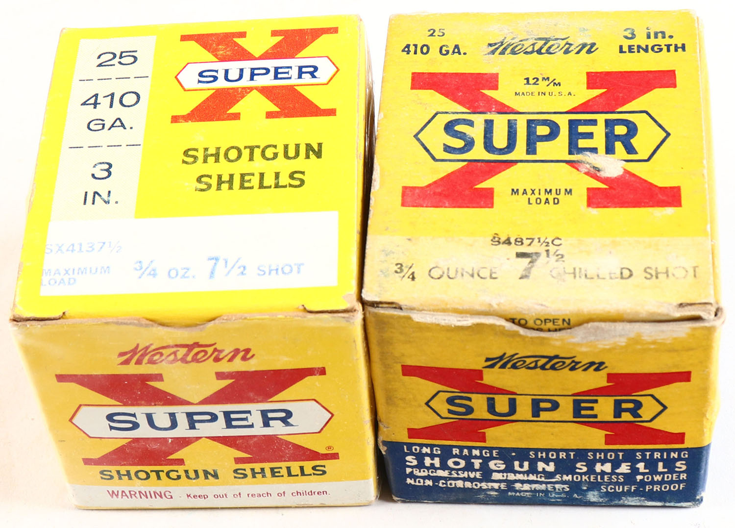 Lot of 2 Western Super X, 410ga., 1pc., Appears Full, shot size 7 1/2 and 7CH., multi-colored boxes. Grade: Very Good ++ - Value: 10 to 60