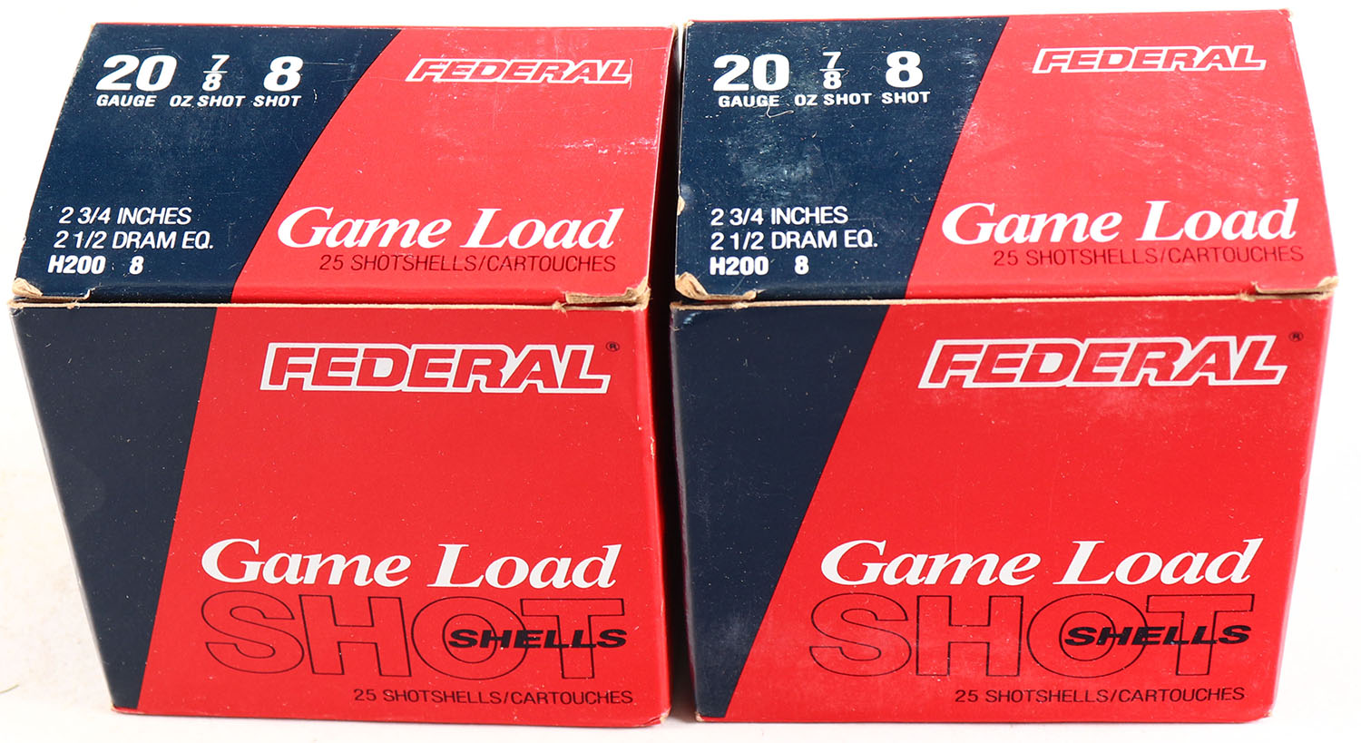 Lot of 2 Federal, 20ga., 1pc., Appears full, shot size 8, multi-colored boxes. Grade: Excellent - Value: 10 to 30