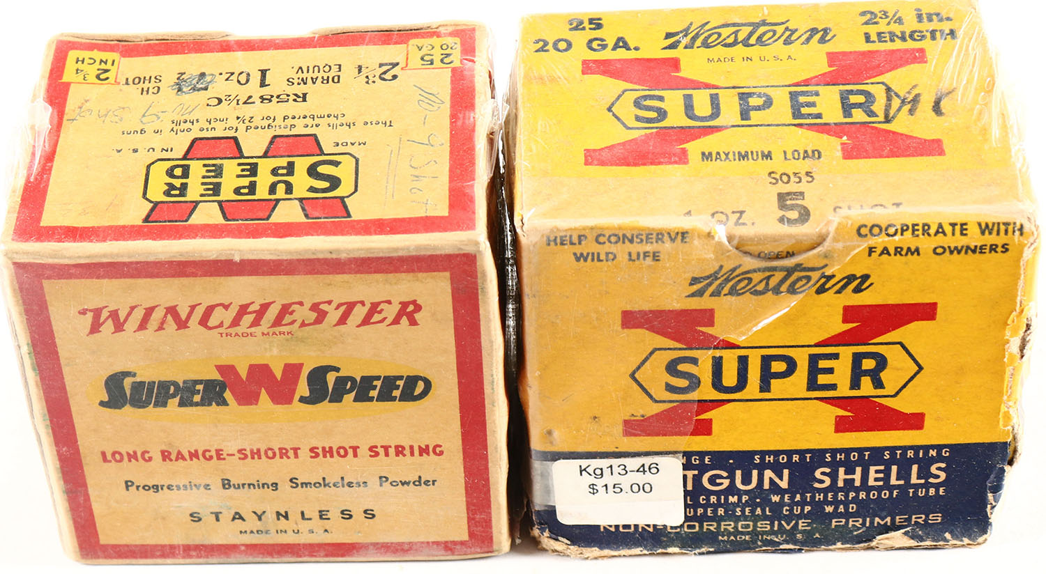 Lot of 2 Western & Winchester, 20ga., 1pc., Appears Full, shot size 7 1/2CH. & 5, multi-colored boxes. Grade: Very Good + - Value: 10 to 30
