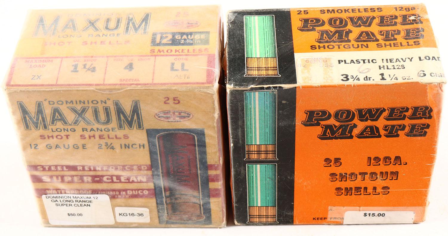 Lot of 2 Dominion & Power Mate 12ga., 1pc., Appears Full, shot size 4 & 6CH., multi-colored boxes. Grade: Very Good ++ - Value: 10 to 30