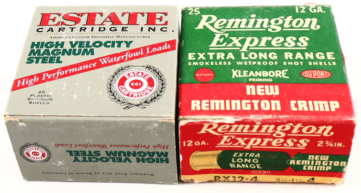 Lot of 2 Remington & Estate, 12ga., 1pc., Appears Full, shot size BB & 4, multi-colored boxes. Grade: Very Good ++ - Value: 10 to 30