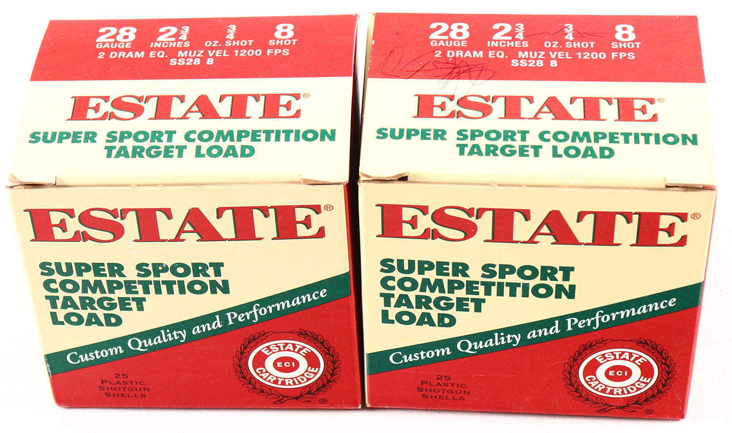 Lot of 2 Estate, 28ga., 1pc., Appears Full, shot size 8, multi-colored box. Grade: Excellent - Value: 10 to 30