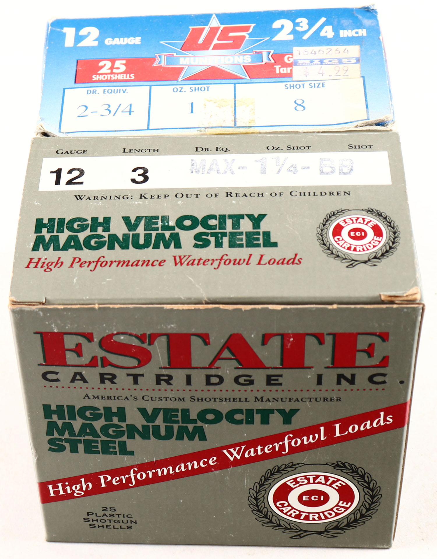 Lot of 2 Estate & US Munitions, 12ga., 1pc., Appears Full, shot size 8 & BB, multi-colored boxes. Grade: Very Good - Value: 10 to 30