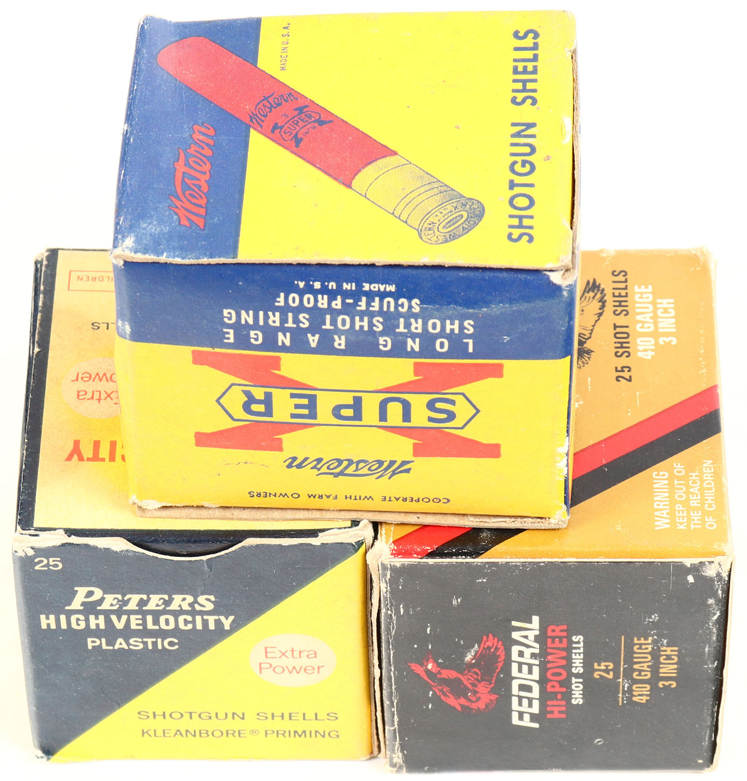 Lot of 3 Mixed Manufacture, 410ga., 1pc., Appears Partial, shot size 4 & 6, multi-colored boxes. Grade: Very Good - Value: 10 to 30